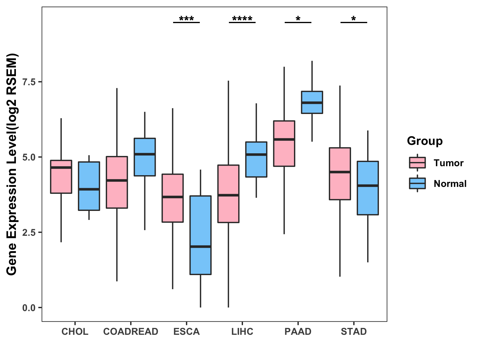 ( * : 0.01-0.05 , ** : 0.005-0.01 , *** : 0.0001-0.005 , **** : < 0.0001 ) |