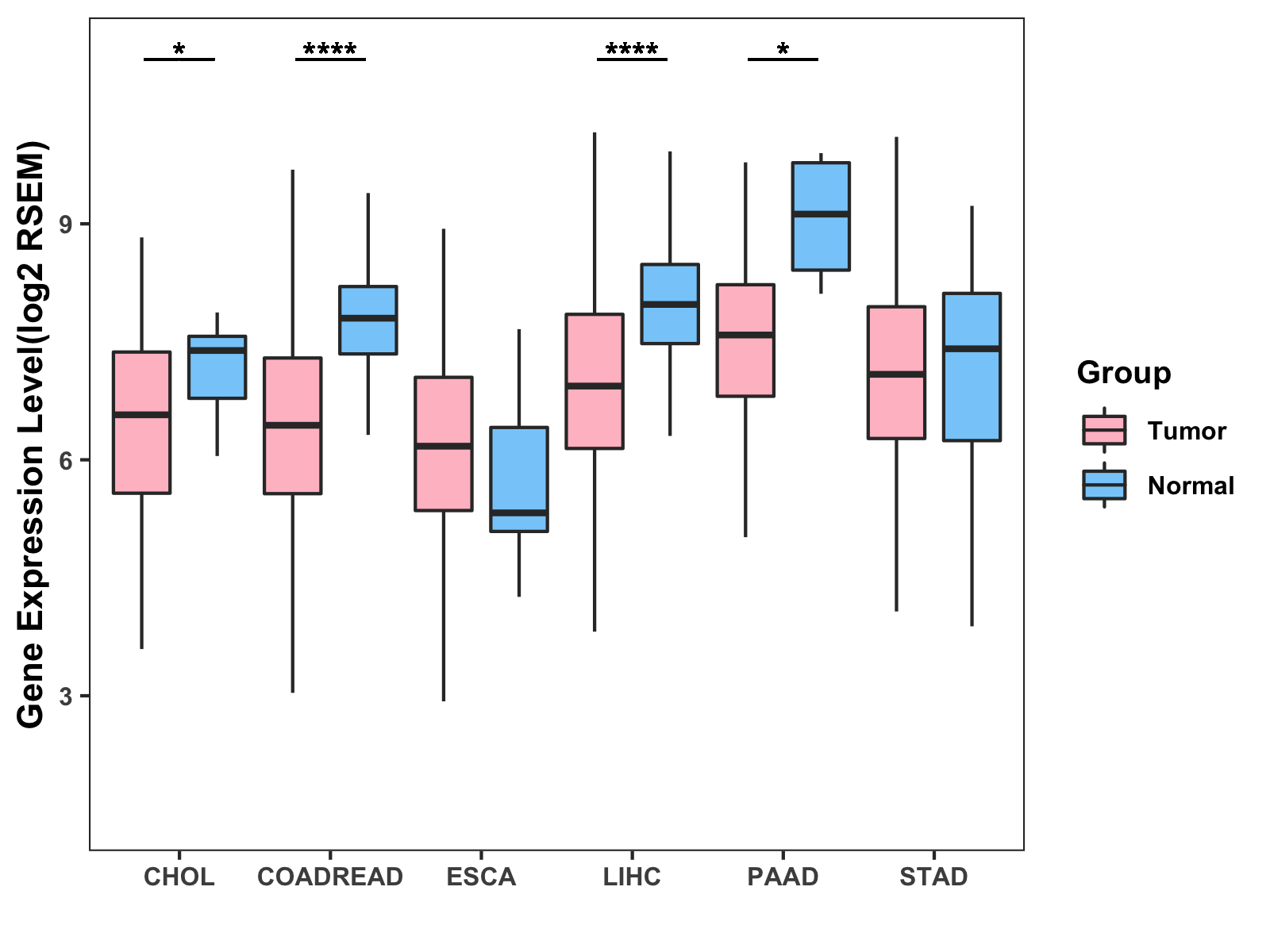 ( * : 0.01-0.05 , ** : 0.005-0.01 , *** : 0.0001-0.005 , **** : < 0.0001 ) |
