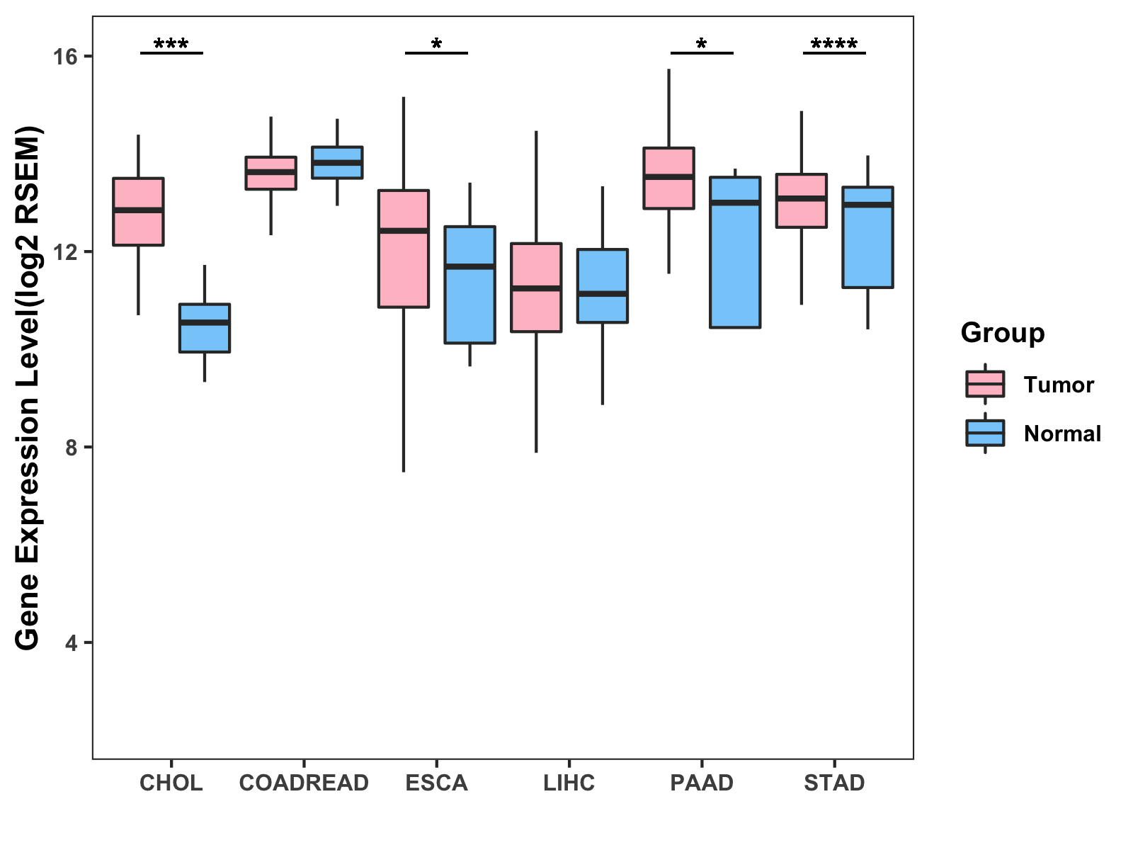 ( * : 0.01-0.05 , ** : 0.005-0.01 , *** : 0.0001-0.005 , **** : < 0.0001 ) |