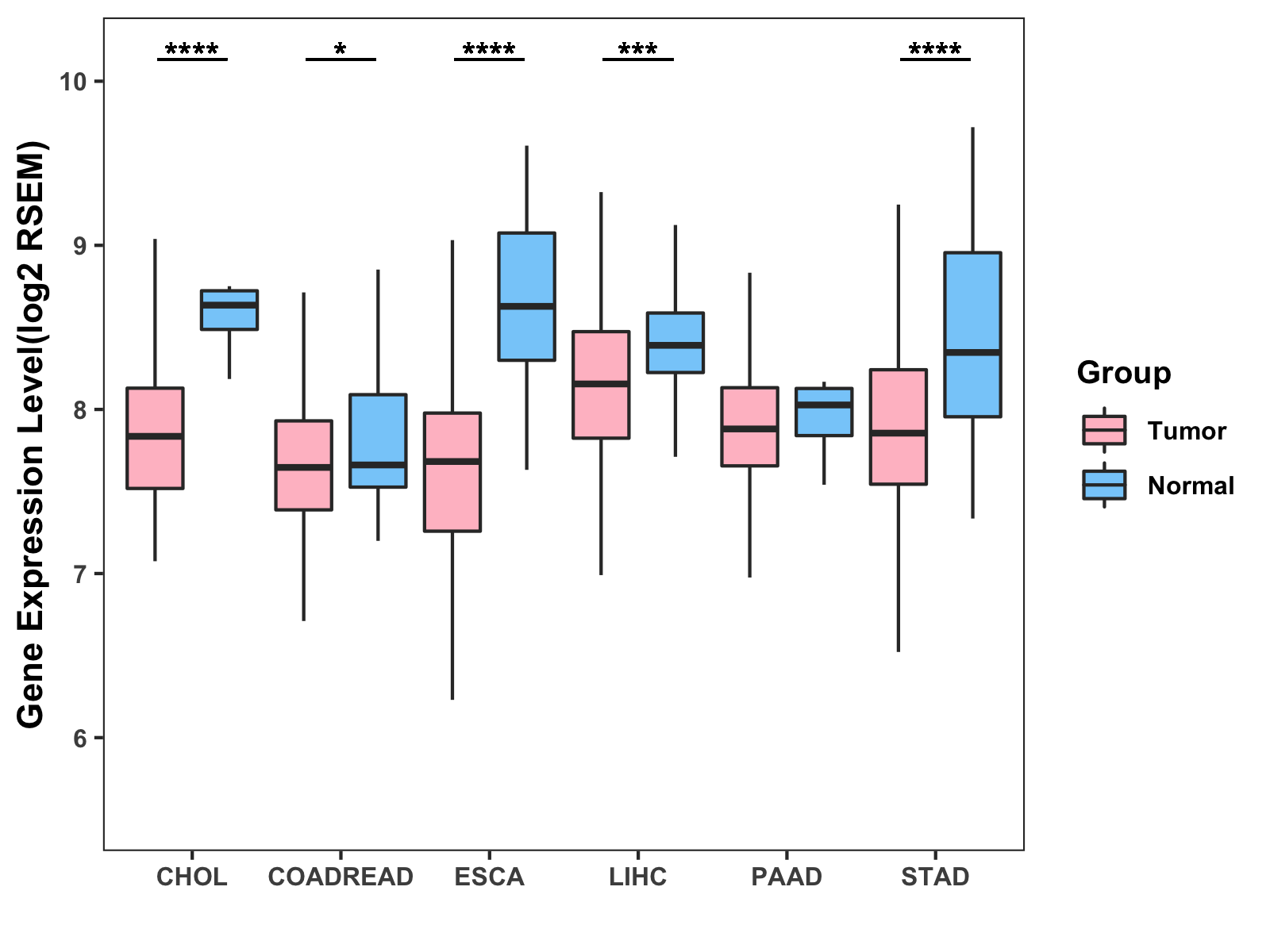 ( * : 0.01-0.05 , ** : 0.005-0.01 , *** : 0.0001-0.005 , **** : < 0.0001 ) |