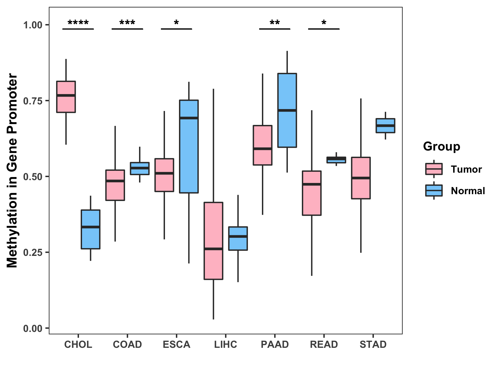 Boxplot of All Gastrointestinal Cancer ( * : 0.01-0.05 , ** : 0.005-0.01 , *** : 0.0001-0.005 , **** : < 0.0001 ) |