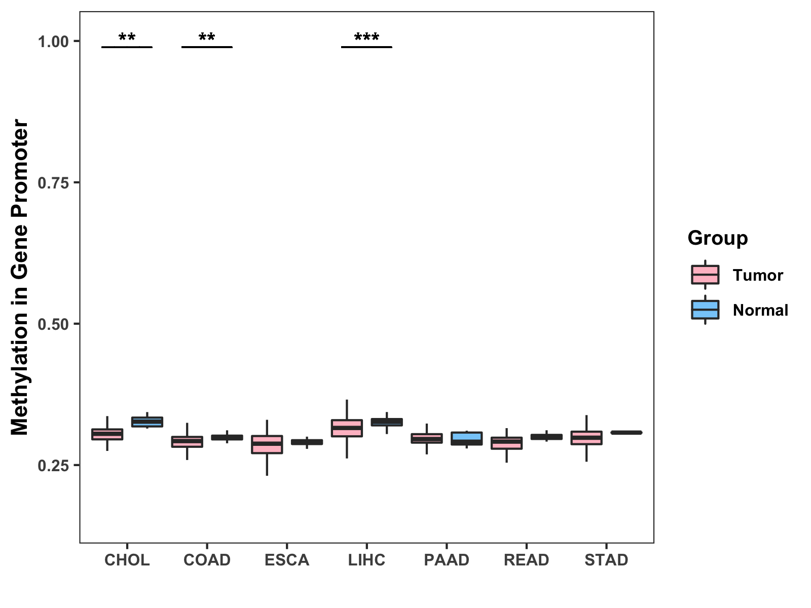 Boxplot of All Gastrointestinal Cancer ( * : 0.01-0.05 , ** : 0.005-0.01 , *** : 0.0001-0.005 , **** : < 0.0001 ) |