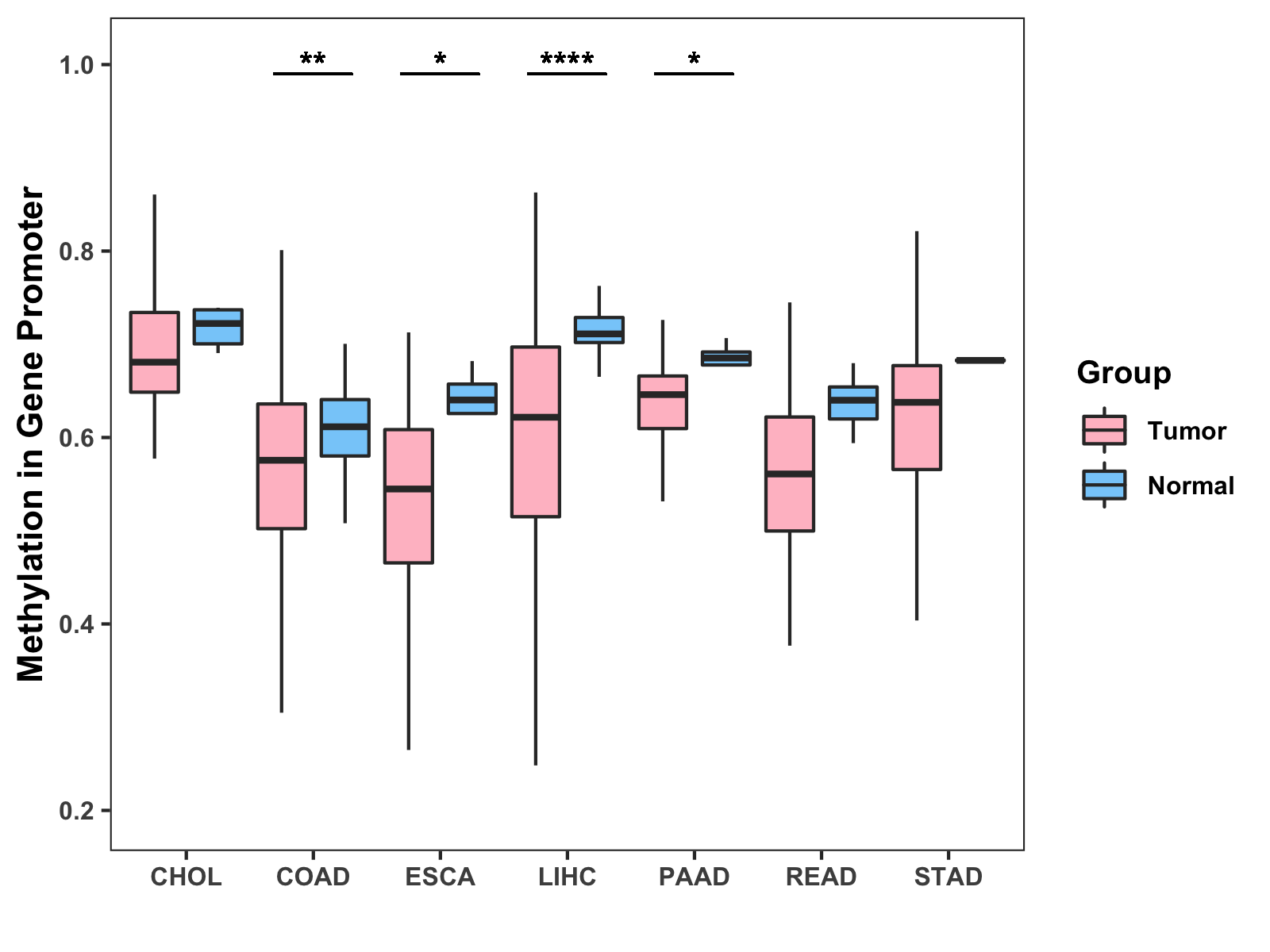 Boxplot of All Gastrointestinal Cancer ( * : 0.01-0.05 , ** : 0.005-0.01 , *** : 0.0001-0.005 , **** : < 0.0001 ) |
