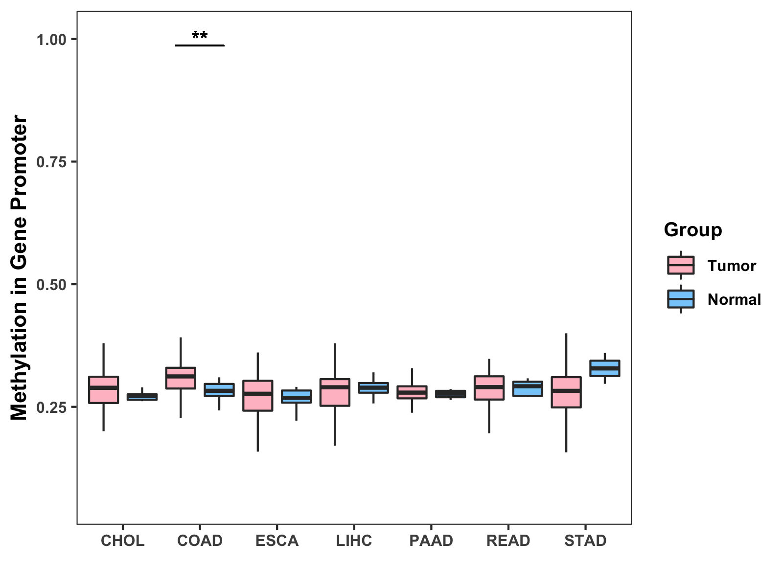 Boxplot of All Gastrointestinal Cancer ( * : 0.01-0.05 , ** : 0.005-0.01 , *** : 0.0001-0.005 , **** : < 0.0001 ) |