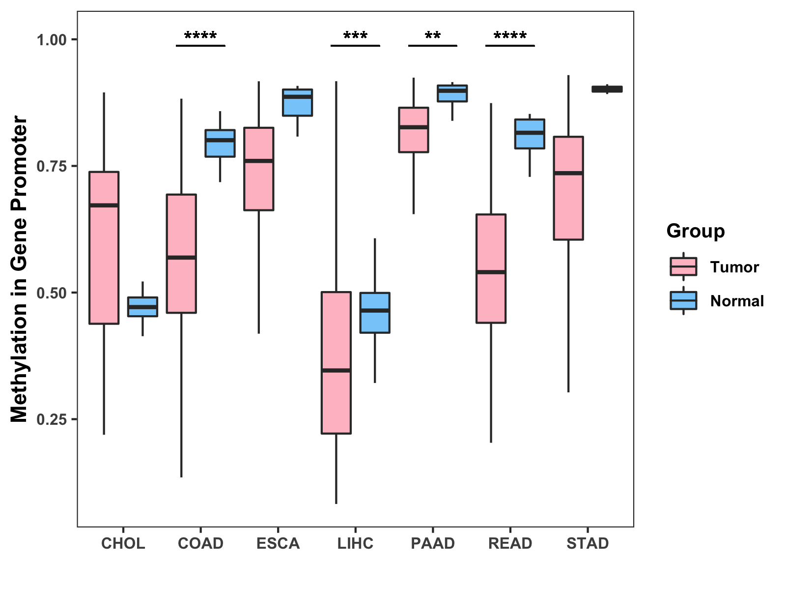 Boxplot of All Gastrointestinal Cancer ( * : 0.01-0.05 , ** : 0.005-0.01 , *** : 0.0001-0.005 , **** : < 0.0001 ) |