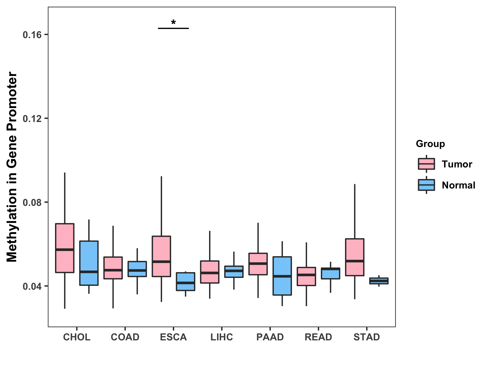 Boxplot of All Gastrointestinal Cancer ( * : 0.01-0.05 , ** : 0.005-0.01 , *** : 0.0001-0.005 , **** : < 0.0001 ) |