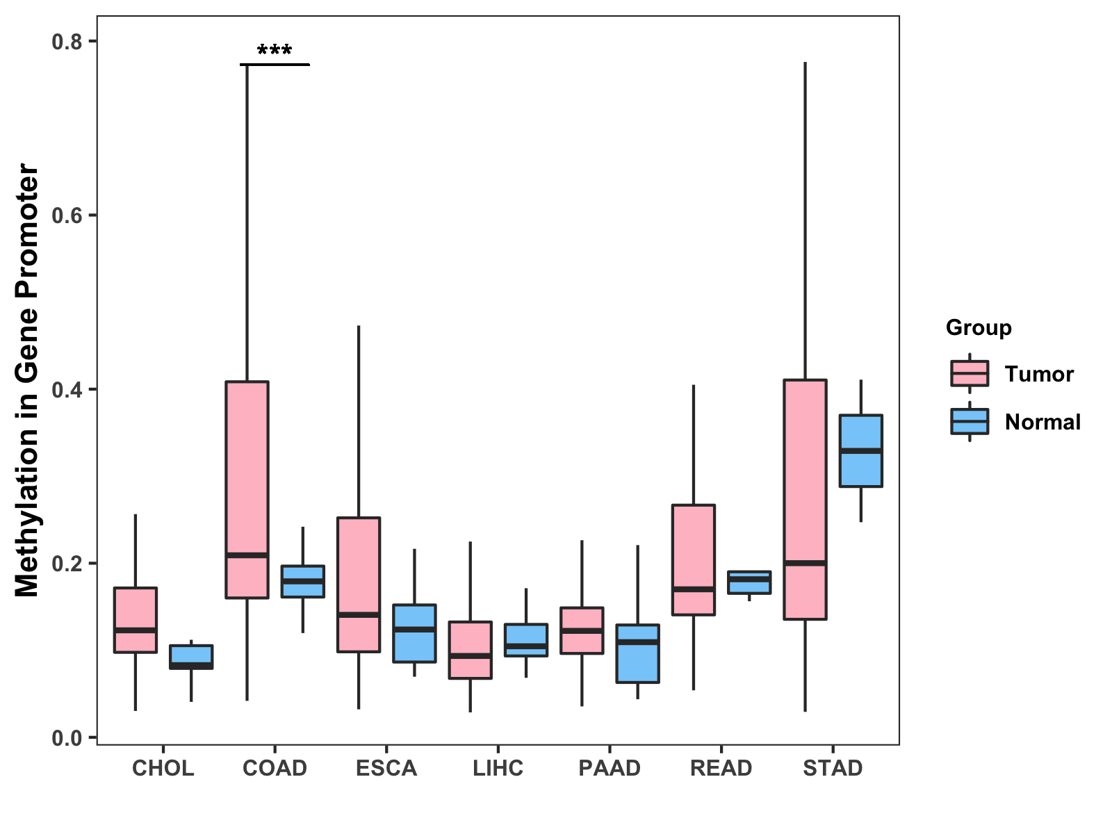 Boxplot of All Gastrointestinal Cancer ( * : 0.01-0.05 , ** : 0.005-0.01 , *** : 0.0001-0.005 , **** : < 0.0001 ) |