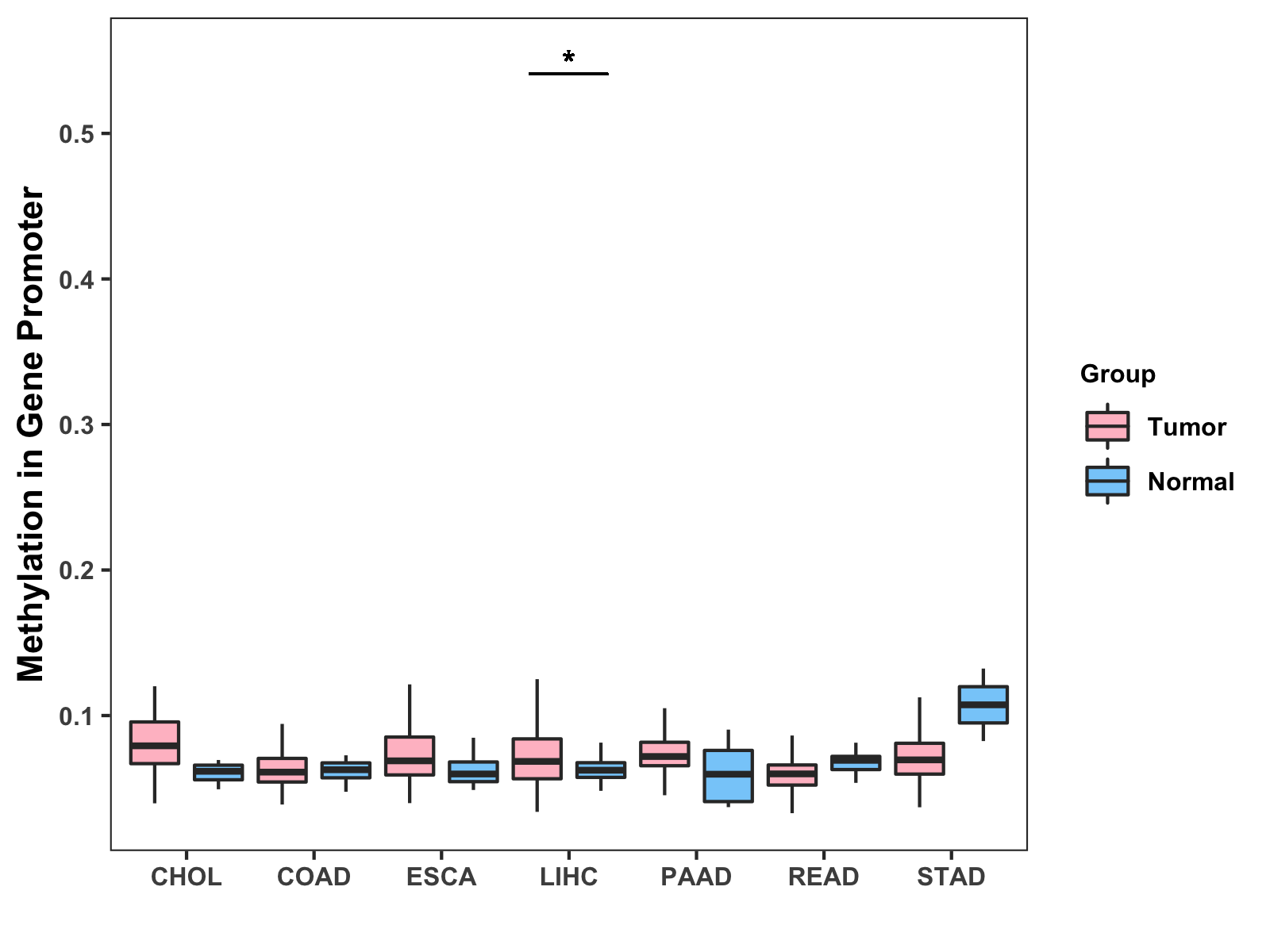 Boxplot of All Gastrointestinal Cancer ( * : 0.01-0.05 , ** : 0.005-0.01 , *** : 0.0001-0.005 , **** : < 0.0001 ) |