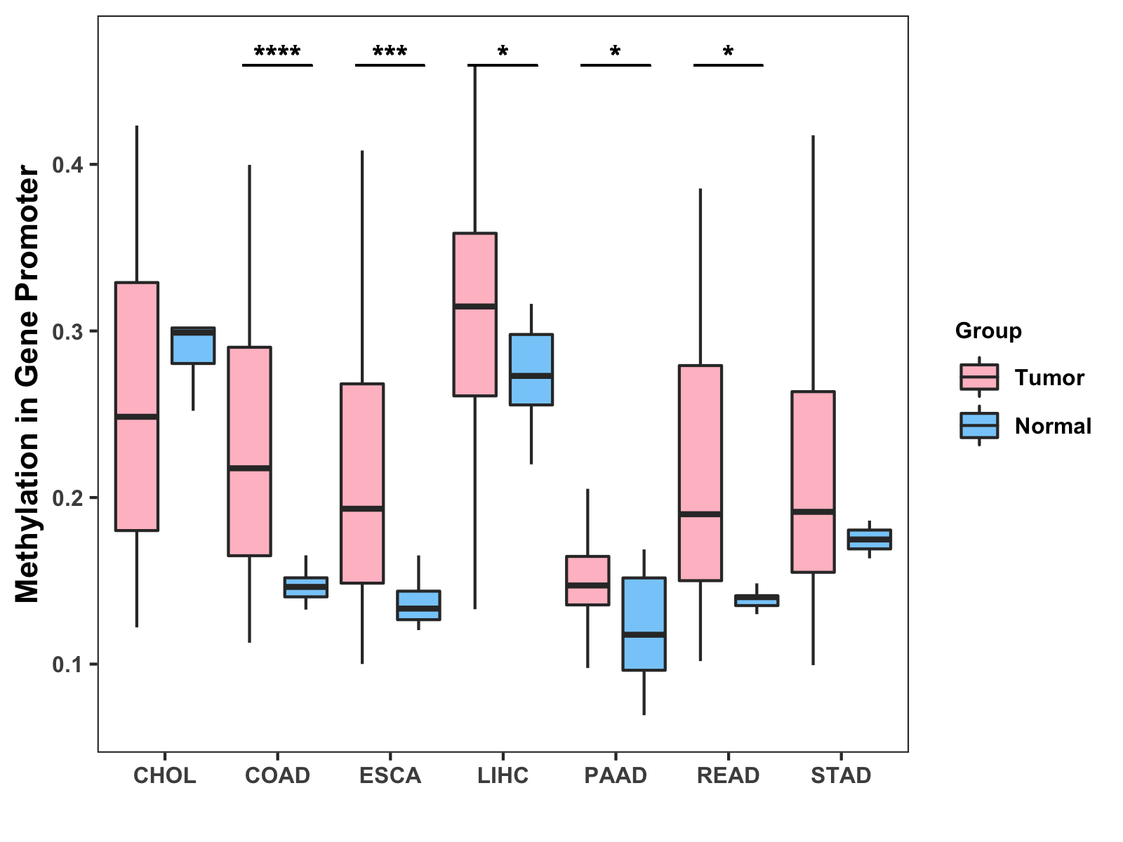 Boxplot of All Gastrointestinal Cancer ( * : 0.01-0.05 , ** : 0.005-0.01 , *** : 0.0001-0.005 , **** : < 0.0001 ) |