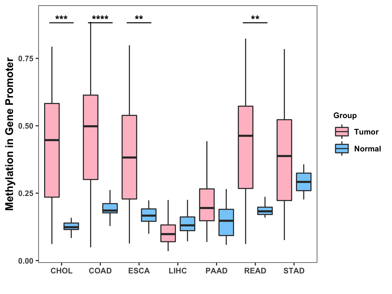 Boxplot of All Gastrointestinal Cancer ( * : 0.01-0.05 , ** : 0.005-0.01 , *** : 0.0001-0.005 , **** : < 0.0001 ) |