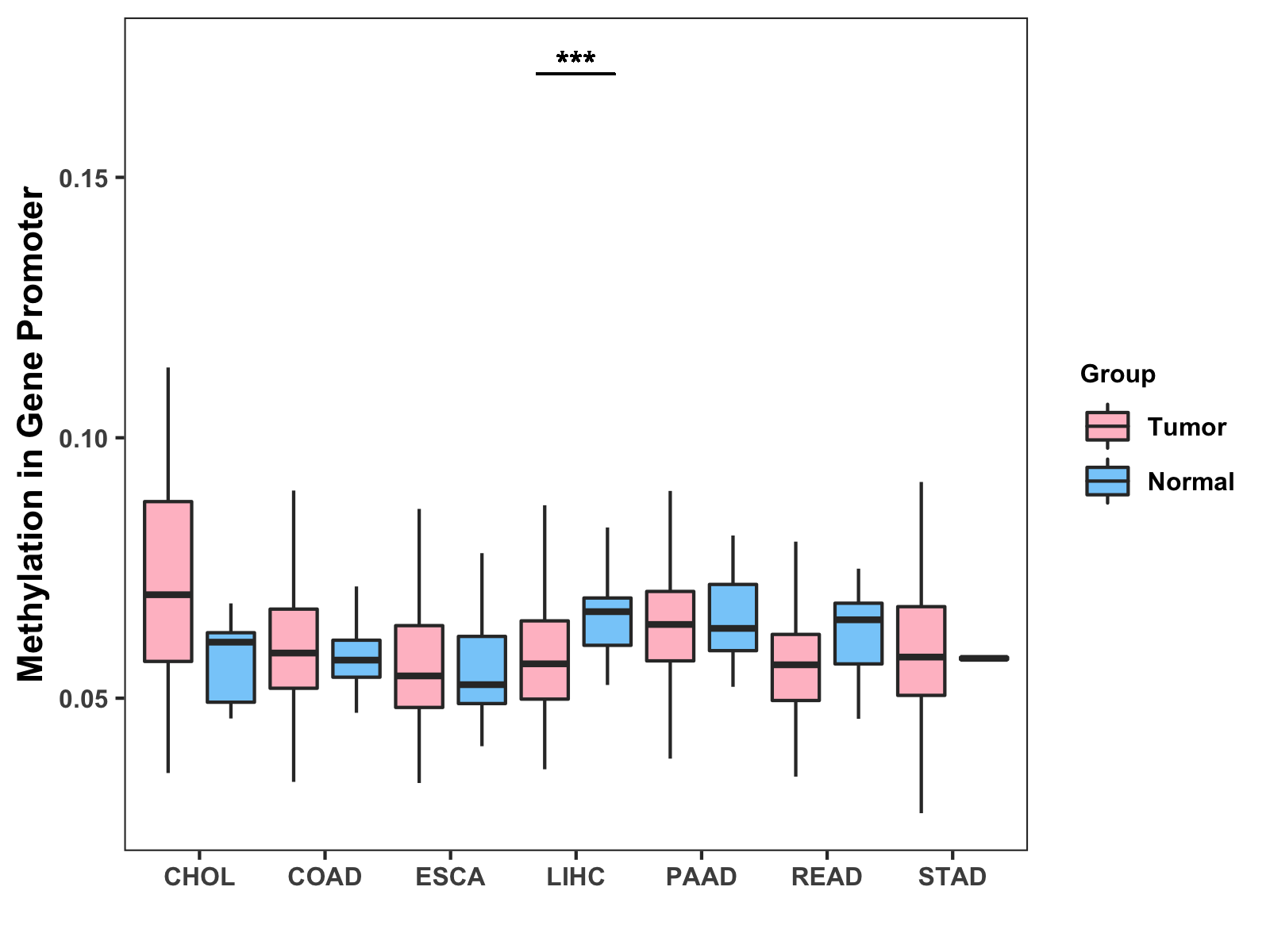 Boxplot of All Gastrointestinal Cancer ( * : 0.01-0.05 , ** : 0.005-0.01 , *** : 0.0001-0.005 , **** : < 0.0001 ) |