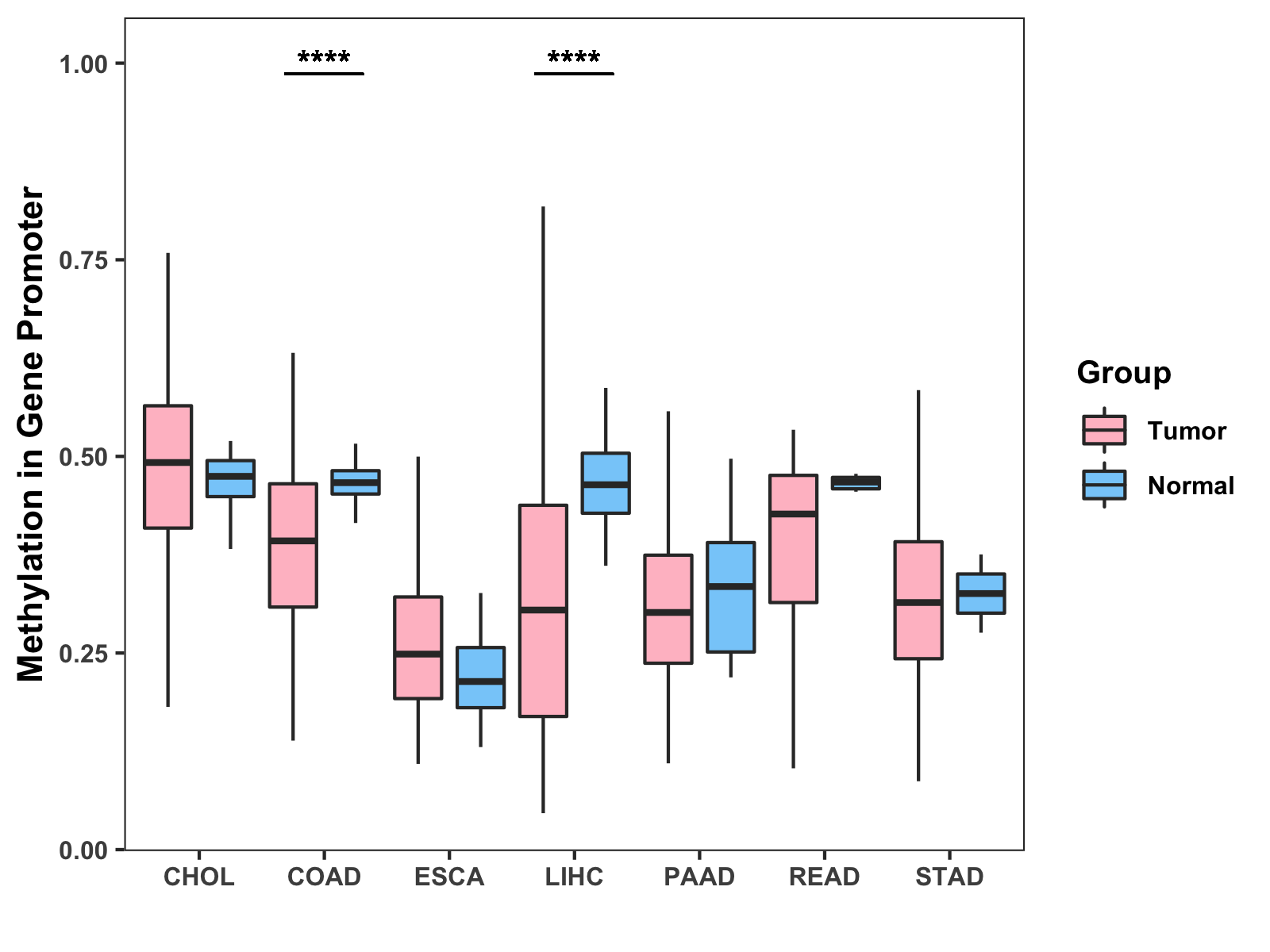 Boxplot of All Gastrointestinal Cancer ( * : 0.01-0.05 , ** : 0.005-0.01 , *** : 0.0001-0.005 , **** : < 0.0001 ) |