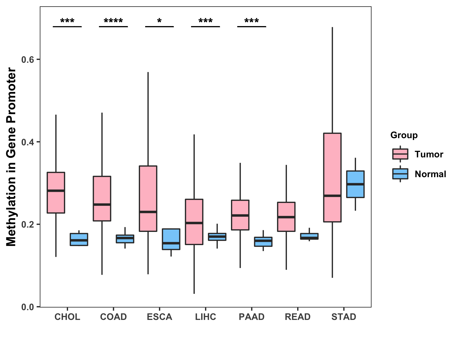 Boxplot of All Gastrointestinal Cancer ( * : 0.01-0.05 , ** : 0.005-0.01 , *** : 0.0001-0.005 , **** : < 0.0001 ) |