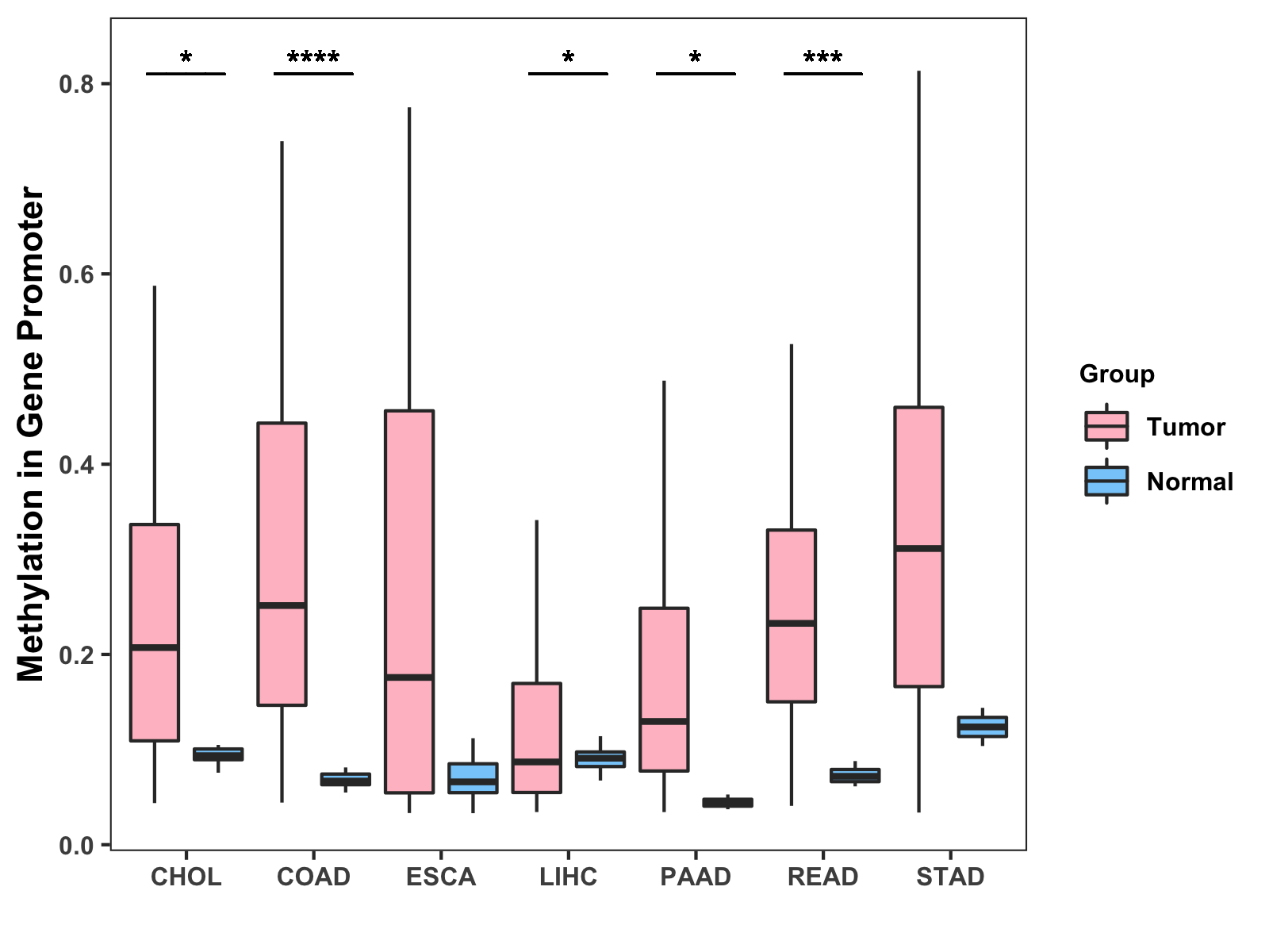 Boxplot of All Gastrointestinal Cancer ( * : 0.01-0.05 , ** : 0.005-0.01 , *** : 0.0001-0.005 , **** : < 0.0001 ) |