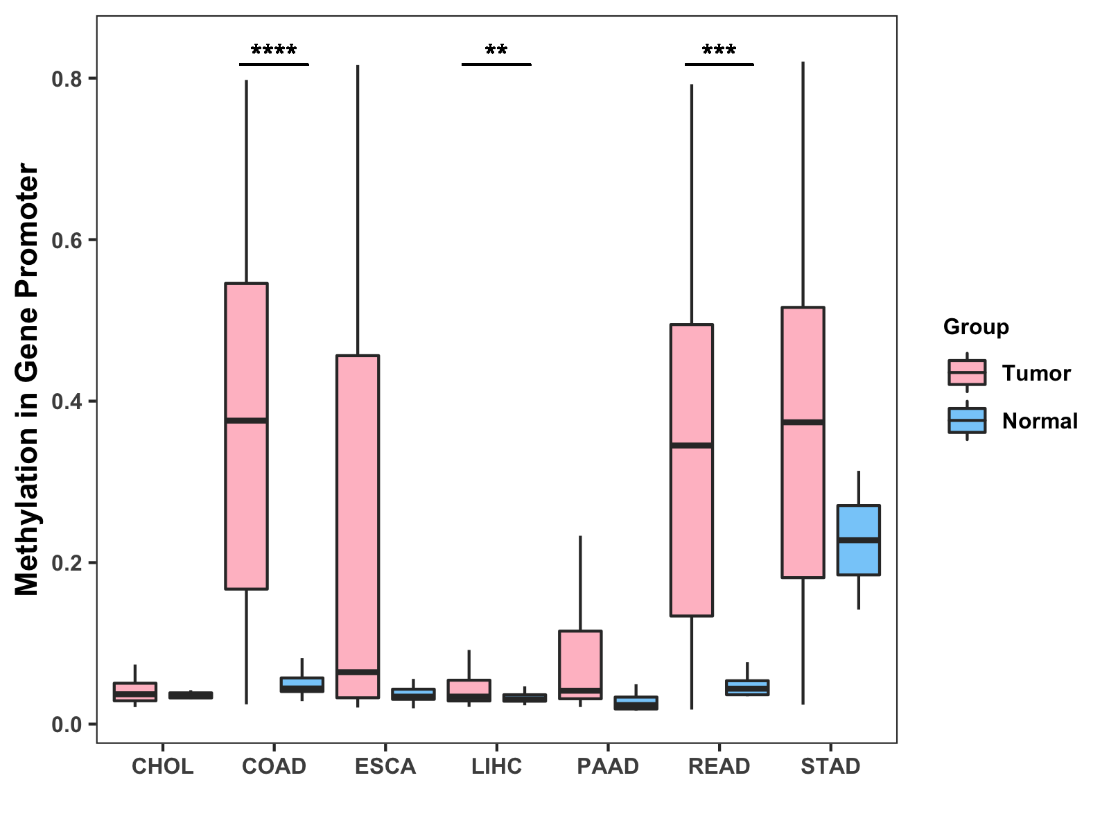 Boxplot of All Gastrointestinal Cancer ( * : 0.01-0.05 , ** : 0.005-0.01 , *** : 0.0001-0.005 , **** : < 0.0001 ) |