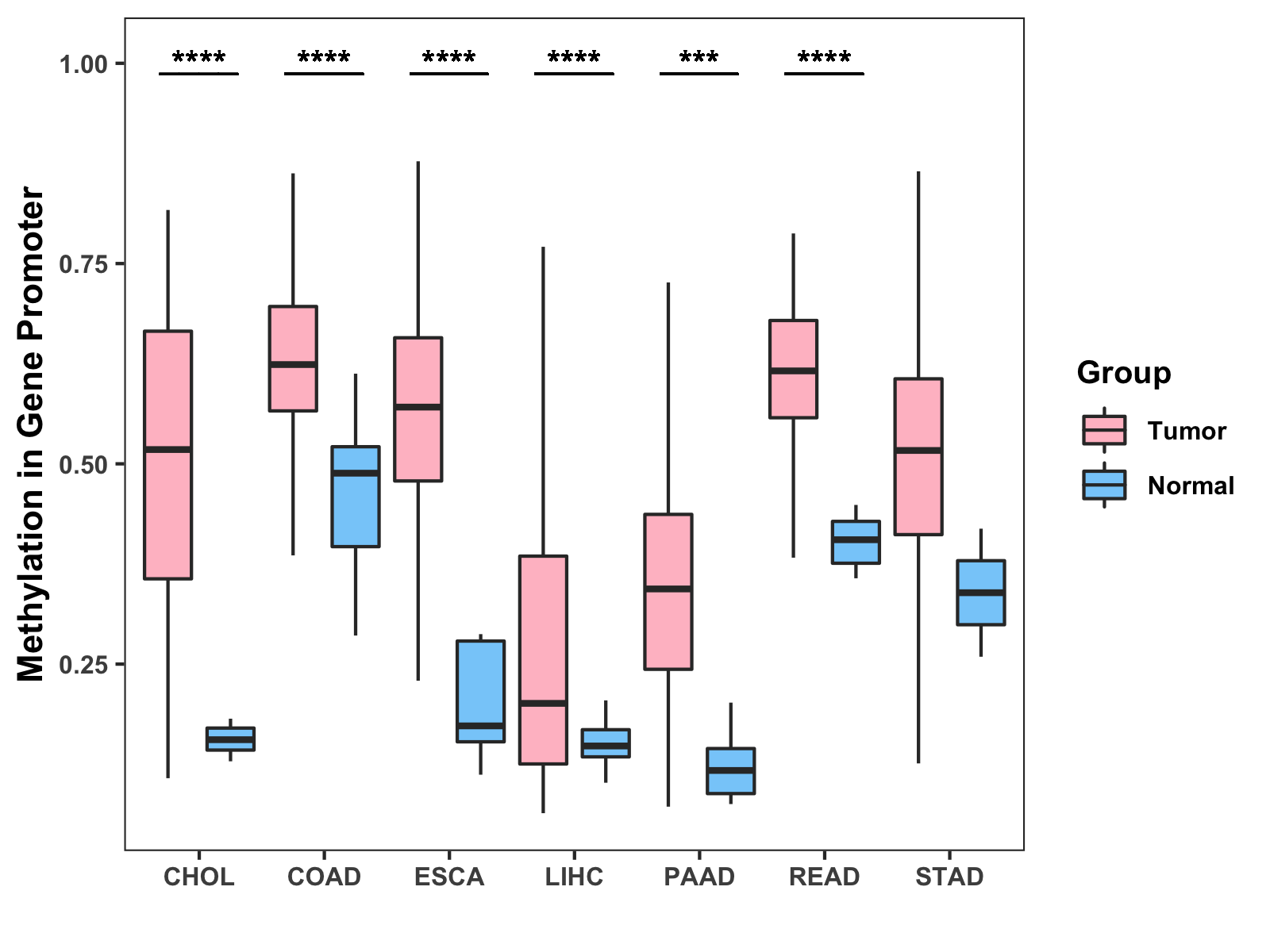 Boxplot of All Gastrointestinal Cancer ( * : 0.01-0.05 , ** : 0.005-0.01 , *** : 0.0001-0.005 , **** : < 0.0001 ) |
