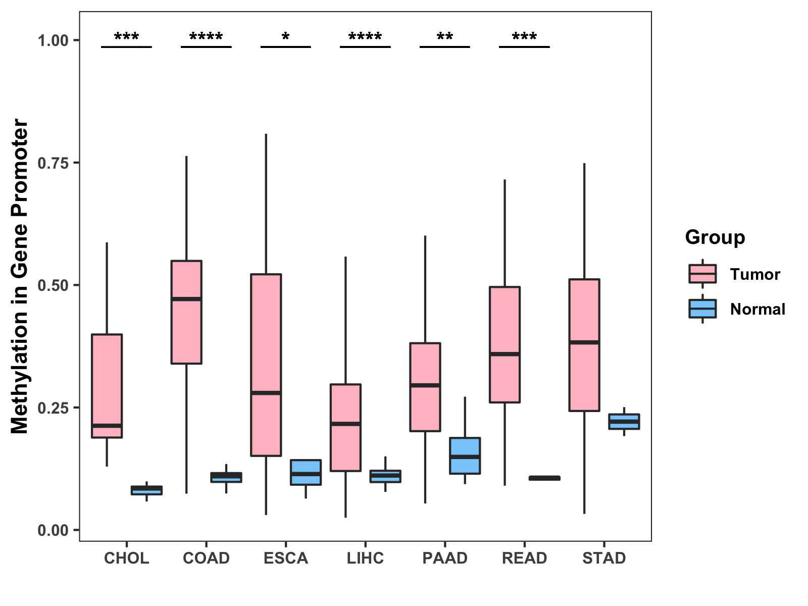 Boxplot of All Gastrointestinal Cancer ( * : 0.01-0.05 , ** : 0.005-0.01 , *** : 0.0001-0.005 , **** : < 0.0001 ) |