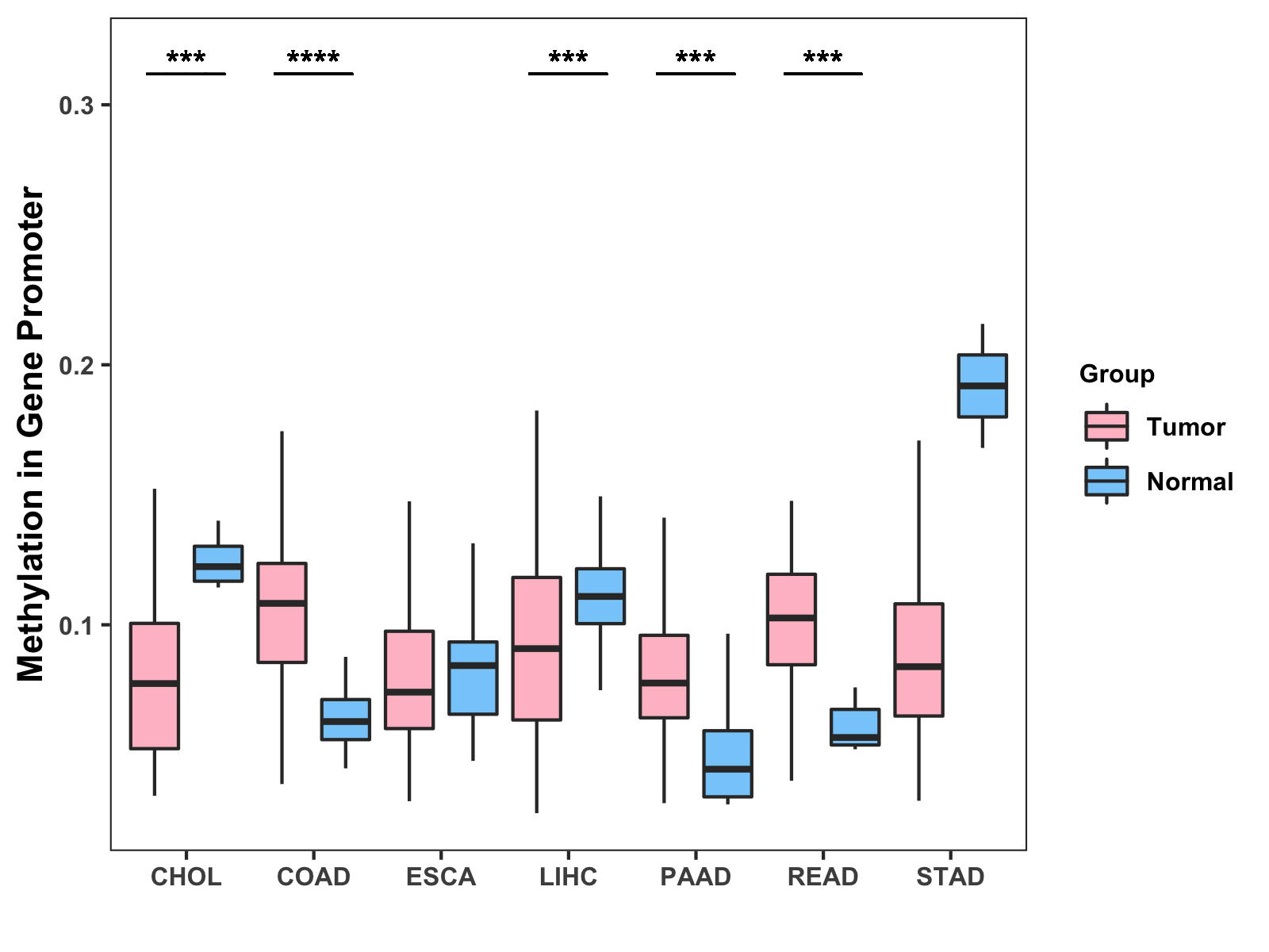 Boxplot of All Gastrointestinal Cancer ( * : 0.01-0.05 , ** : 0.005-0.01 , *** : 0.0001-0.005 , **** : < 0.0001 ) |