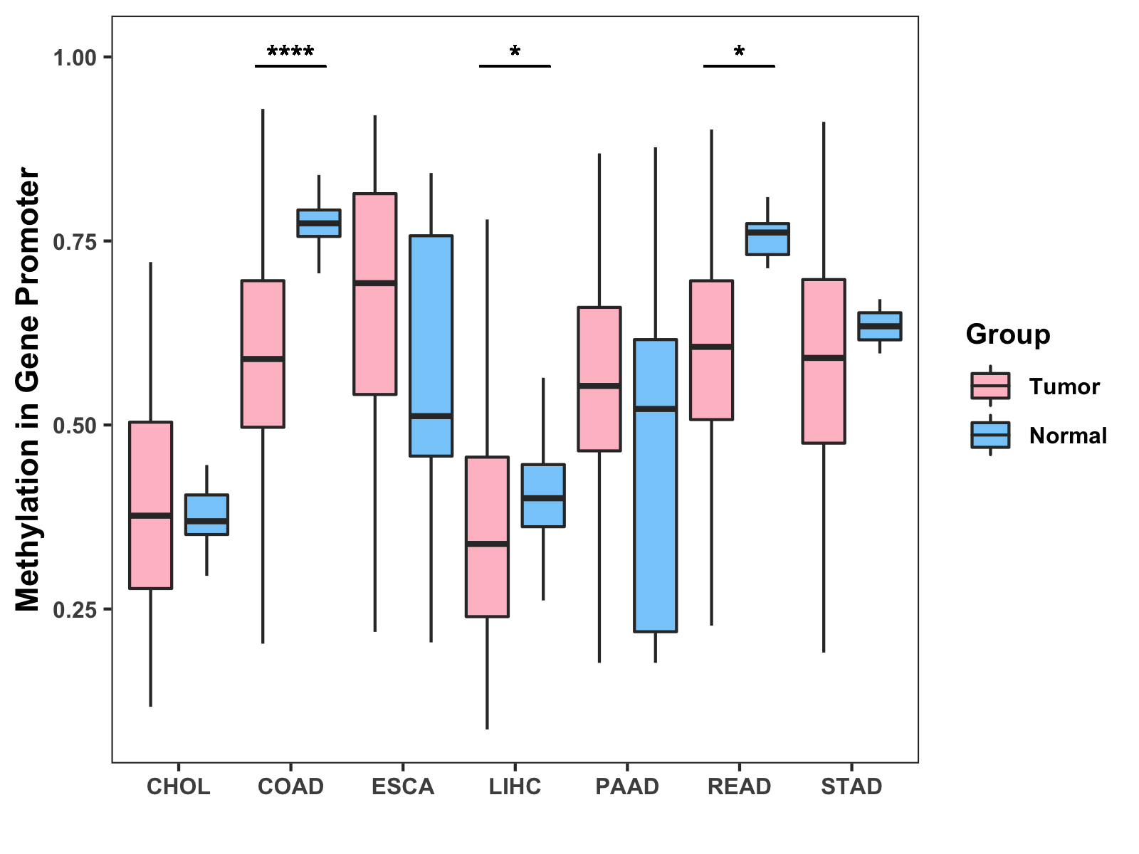 Boxplot of All Gastrointestinal Cancer ( * : 0.01-0.05 , ** : 0.005-0.01 , *** : 0.0001-0.005 , **** : < 0.0001 ) |