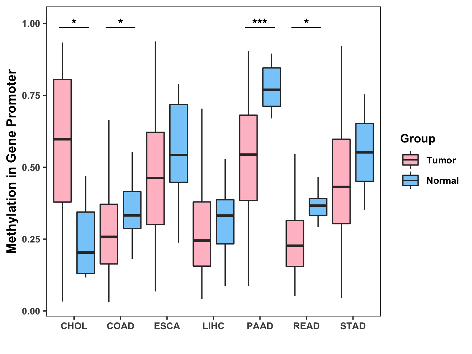 Boxplot of All Gastrointestinal Cancer ( * : 0.01-0.05 , ** : 0.005-0.01 , *** : 0.0001-0.005 , **** : < 0.0001 ) |