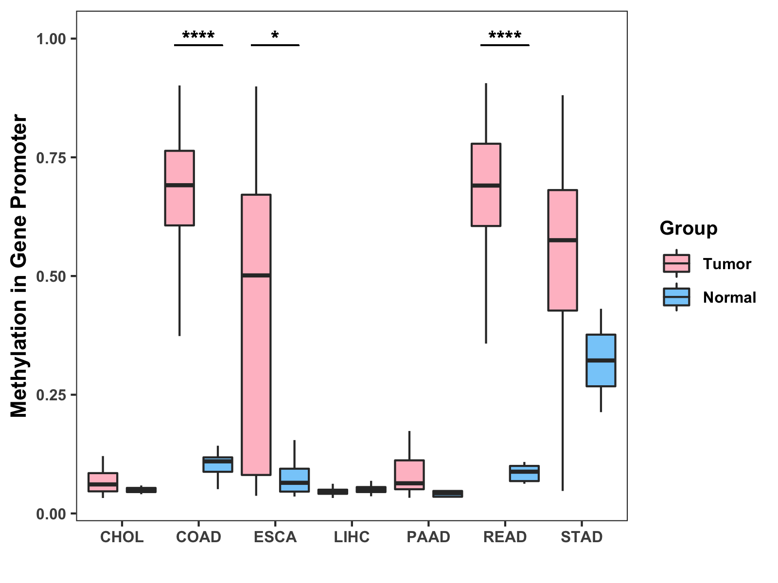 Boxplot of All Gastrointestinal Cancer ( * : 0.01-0.05 , ** : 0.005-0.01 , *** : 0.0001-0.005 , **** : < 0.0001 ) |