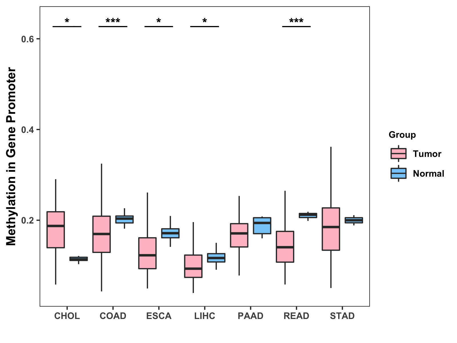 Boxplot of All Gastrointestinal Cancer ( * : 0.01-0.05 , ** : 0.005-0.01 , *** : 0.0001-0.005 , **** : < 0.0001 ) |