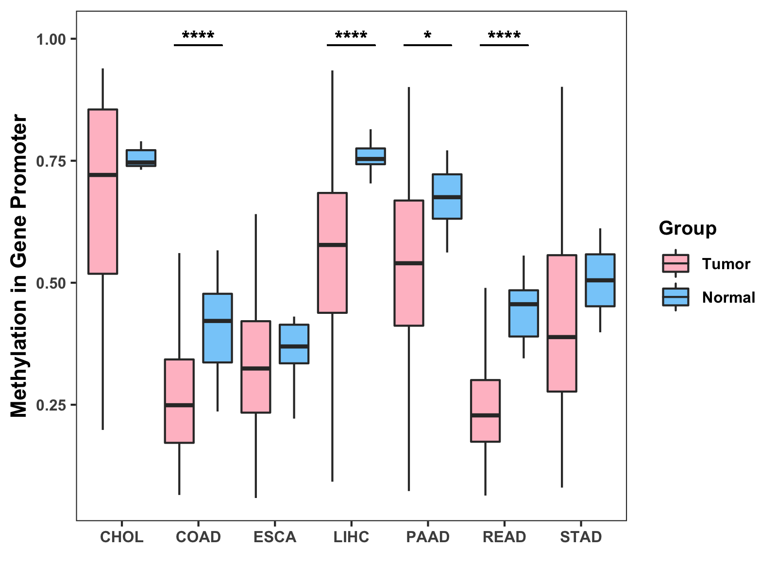 Boxplot of All Gastrointestinal Cancer ( * : 0.01-0.05 , ** : 0.005-0.01 , *** : 0.0001-0.005 , **** : < 0.0001 ) |