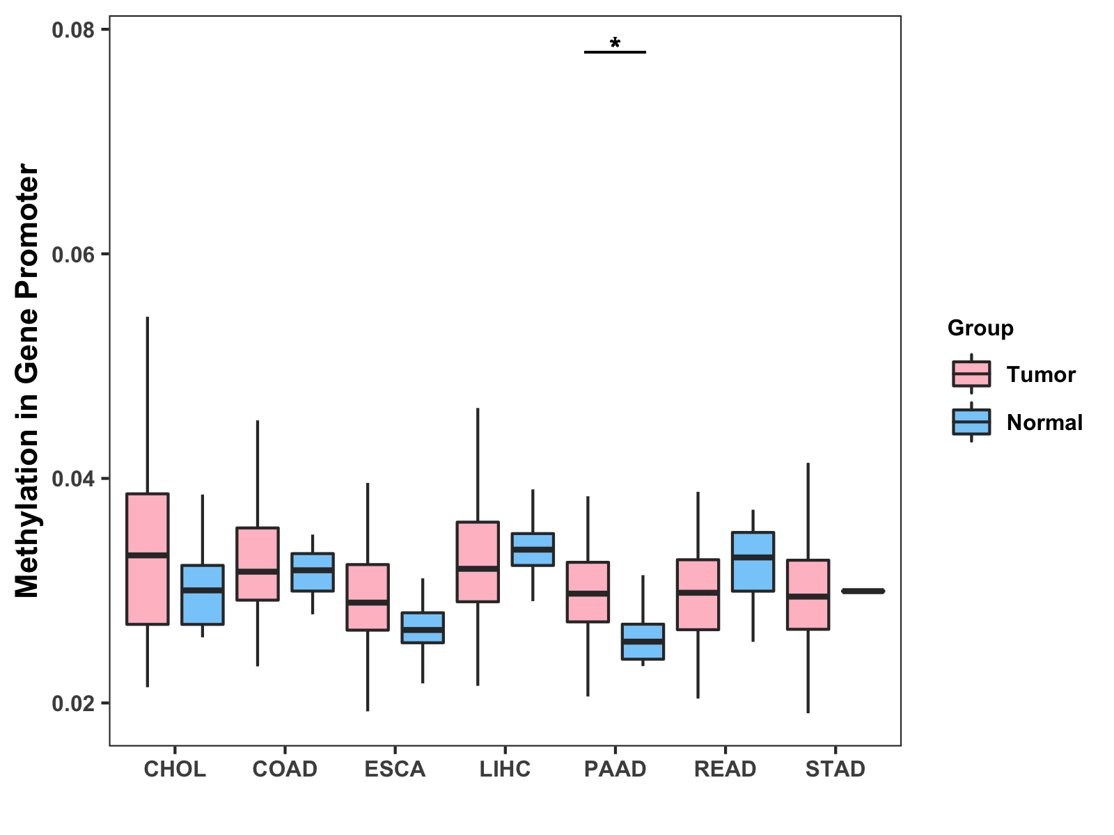 Boxplot of All Gastrointestinal Cancer ( * : 0.01-0.05 , ** : 0.005-0.01 , *** : 0.0001-0.005 , **** : < 0.0001 ) |