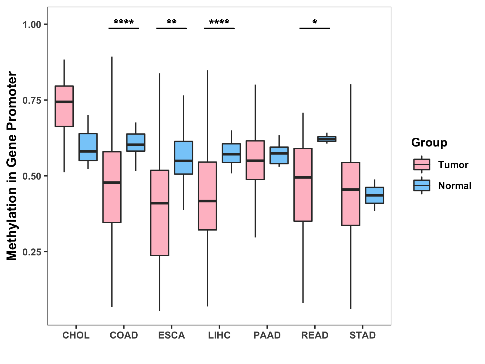 Boxplot of All Gastrointestinal Cancer ( * : 0.01-0.05 , ** : 0.005-0.01 , *** : 0.0001-0.005 , **** : < 0.0001 ) |