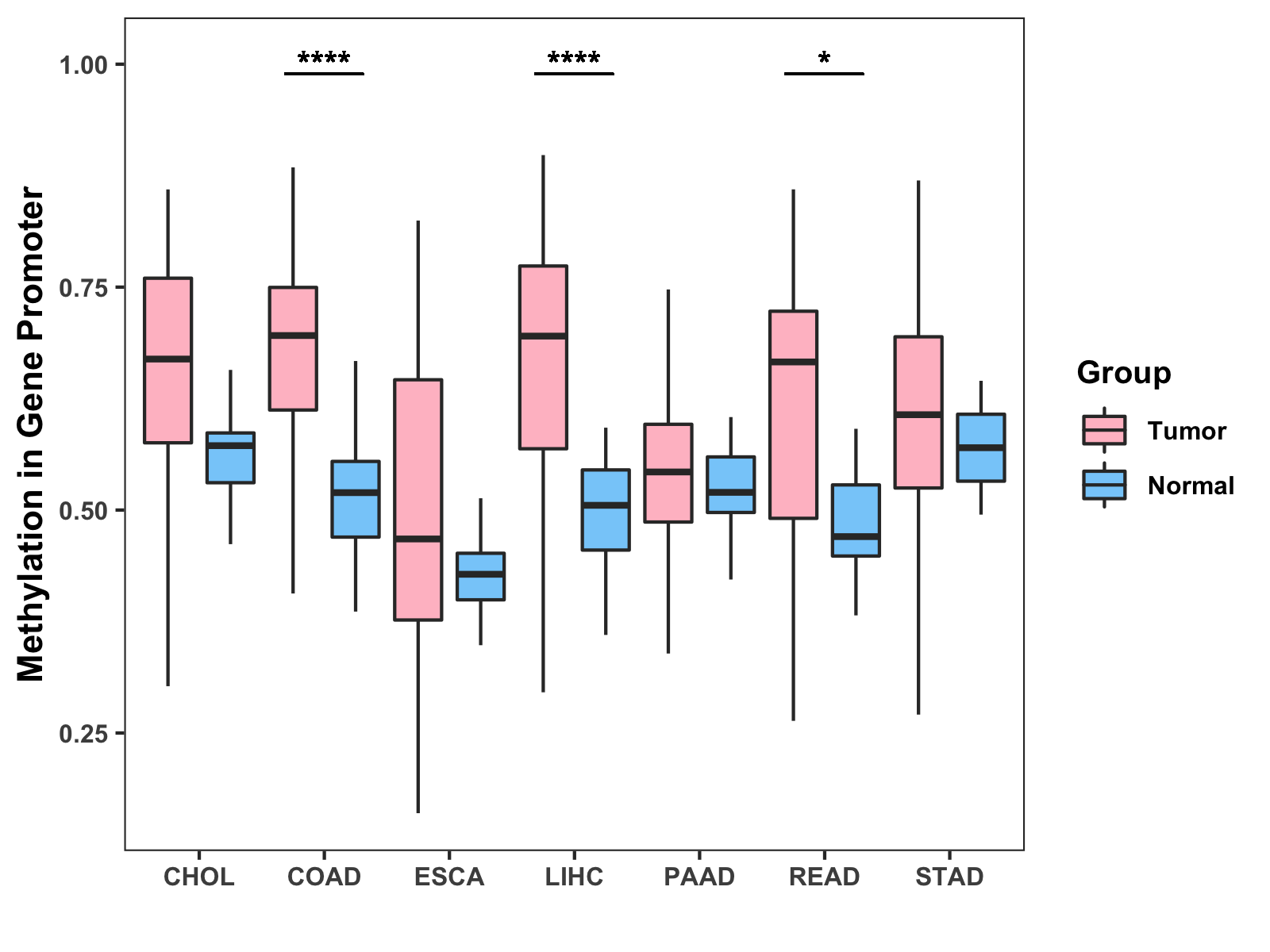Boxplot of All Gastrointestinal Cancer ( * : 0.01-0.05 , ** : 0.005-0.01 , *** : 0.0001-0.005 , **** : < 0.0001 ) |
