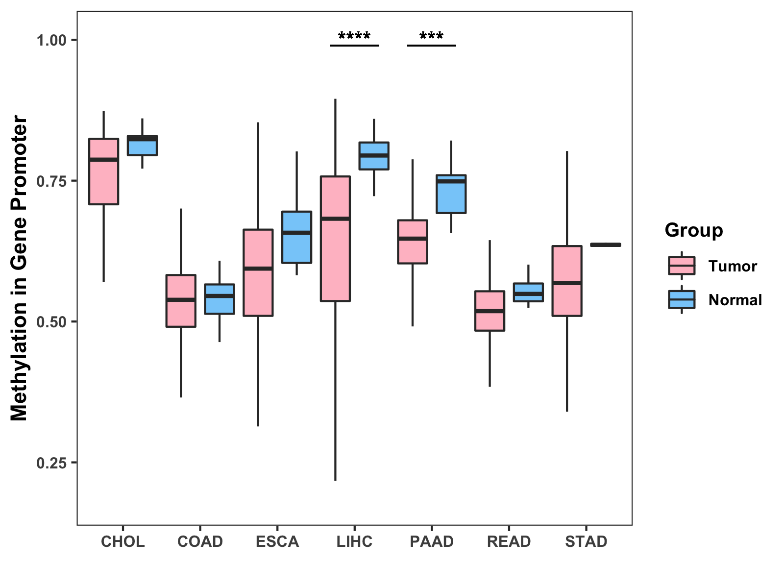 Boxplot of All Gastrointestinal Cancer ( * : 0.01-0.05 , ** : 0.005-0.01 , *** : 0.0001-0.005 , **** : < 0.0001 ) |