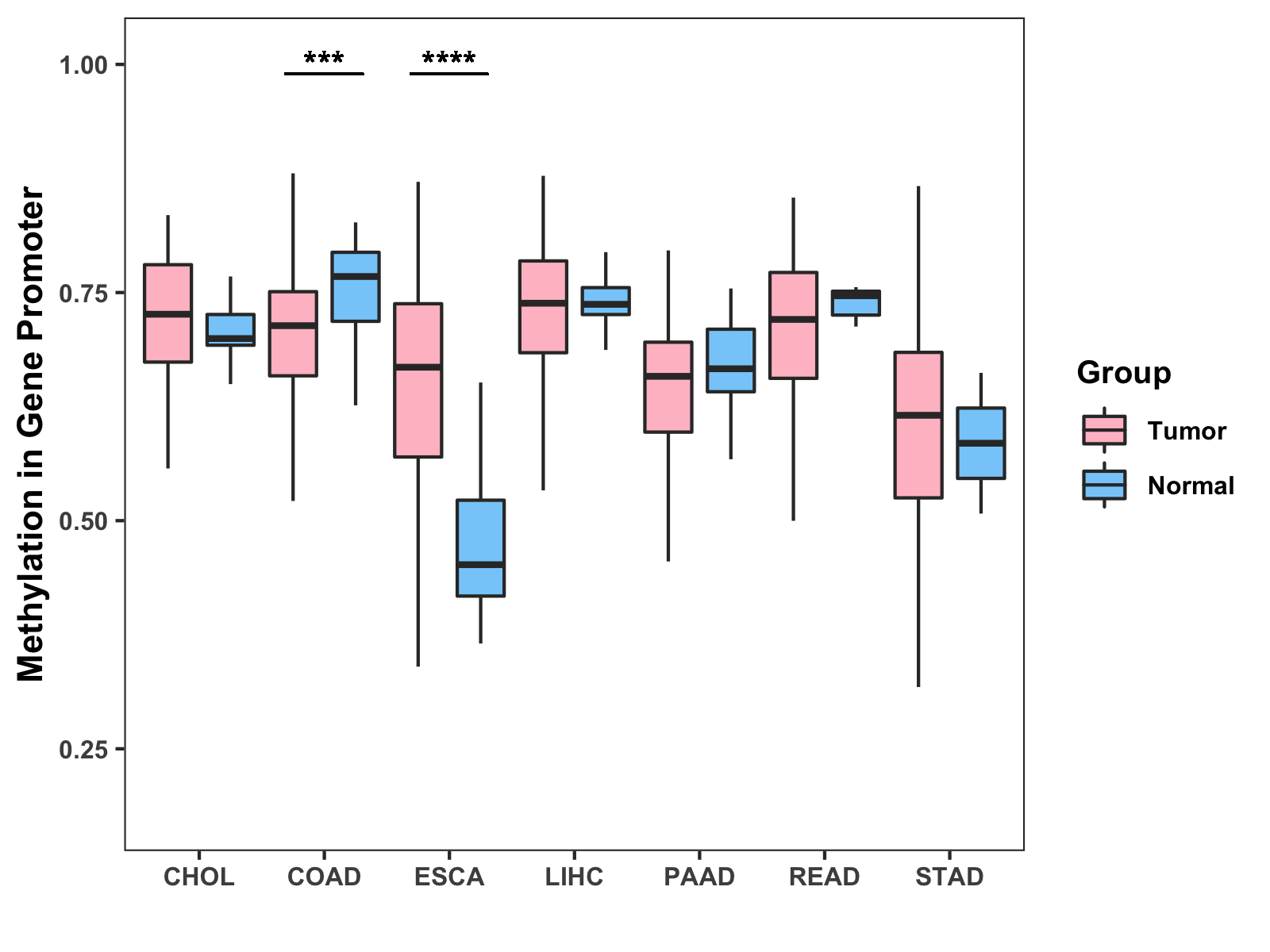 Boxplot of All Gastrointestinal Cancer ( * : 0.01-0.05 , ** : 0.005-0.01 , *** : 0.0001-0.005 , **** : < 0.0001 ) |