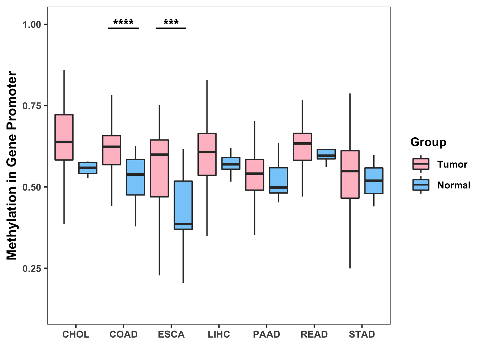 Boxplot of All Gastrointestinal Cancer ( * : 0.01-0.05 , ** : 0.005-0.01 , *** : 0.0001-0.005 , **** : < 0.0001 ) |