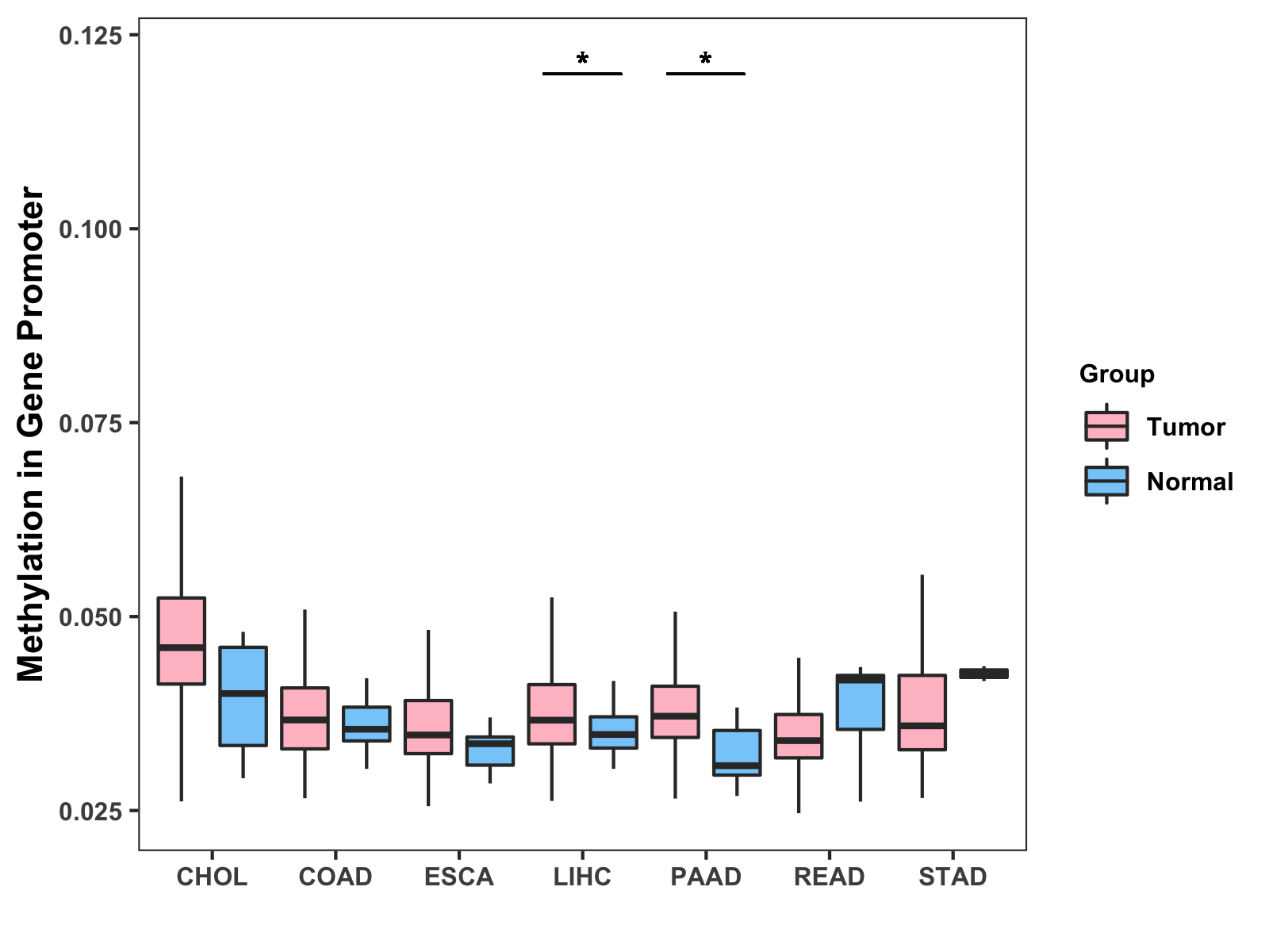 Boxplot of All Gastrointestinal Cancer ( * : 0.01-0.05 , ** : 0.005-0.01 , *** : 0.0001-0.005 , **** : < 0.0001 ) |