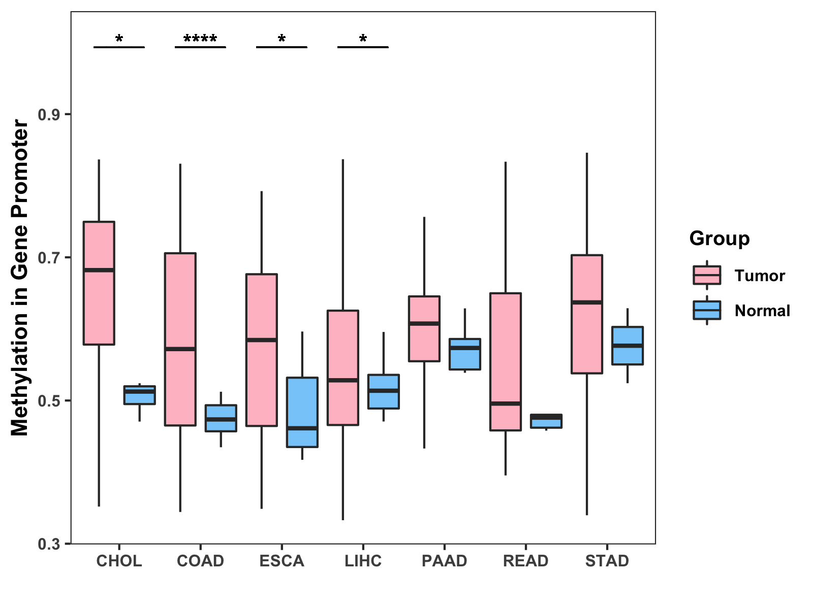Boxplot of All Gastrointestinal Cancer ( * : 0.01-0.05 , ** : 0.005-0.01 , *** : 0.0001-0.005 , **** : < 0.0001 ) |