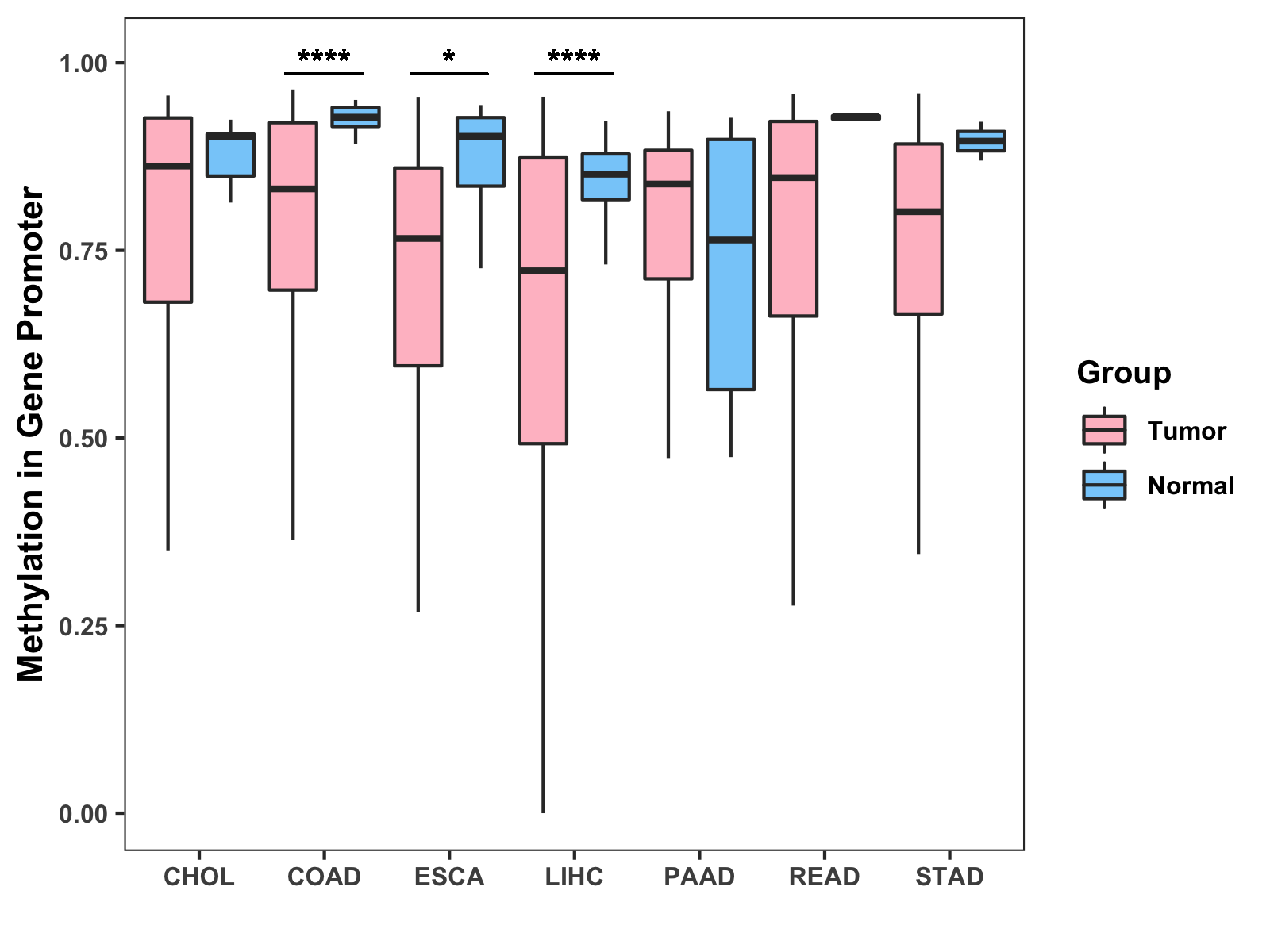 Boxplot of All Gastrointestinal Cancer ( * : 0.01-0.05 , ** : 0.005-0.01 , *** : 0.0001-0.005 , **** : < 0.0001 ) |