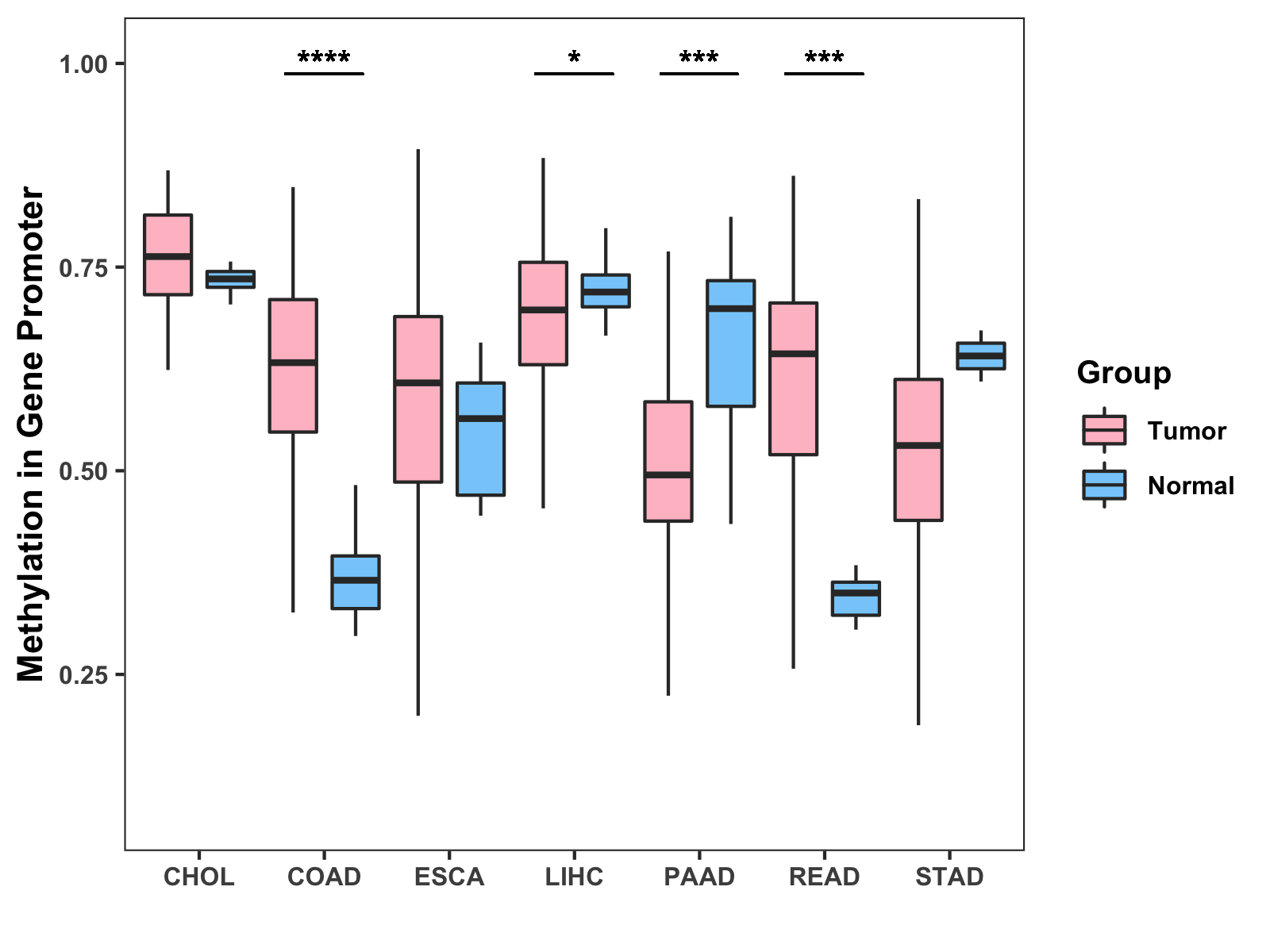 Boxplot of All Gastrointestinal Cancer ( * : 0.01-0.05 , ** : 0.005-0.01 , *** : 0.0001-0.005 , **** : < 0.0001 ) |