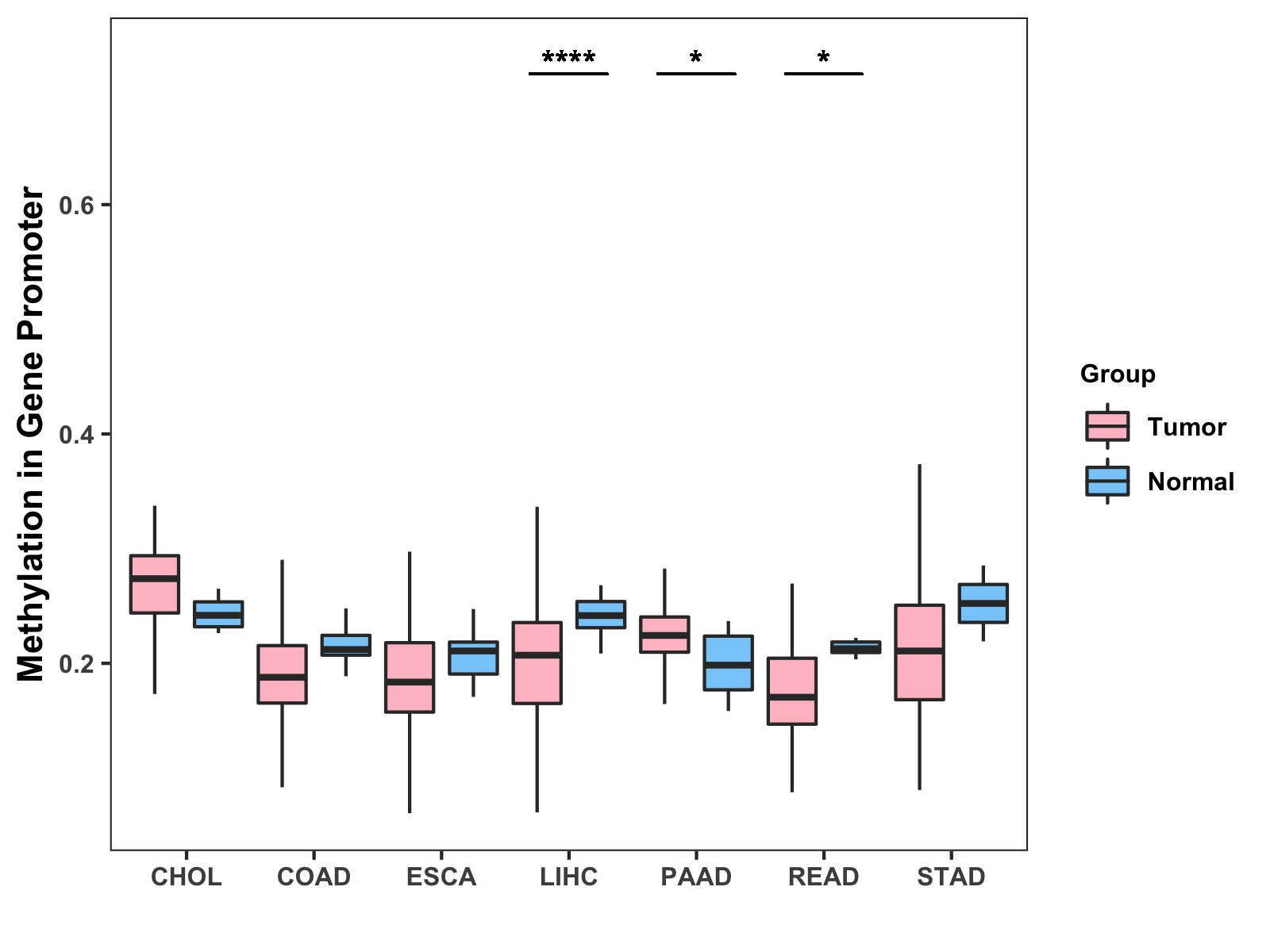 Boxplot of All Gastrointestinal Cancer ( * : 0.01-0.05 , ** : 0.005-0.01 , *** : 0.0001-0.005 , **** : < 0.0001 ) |