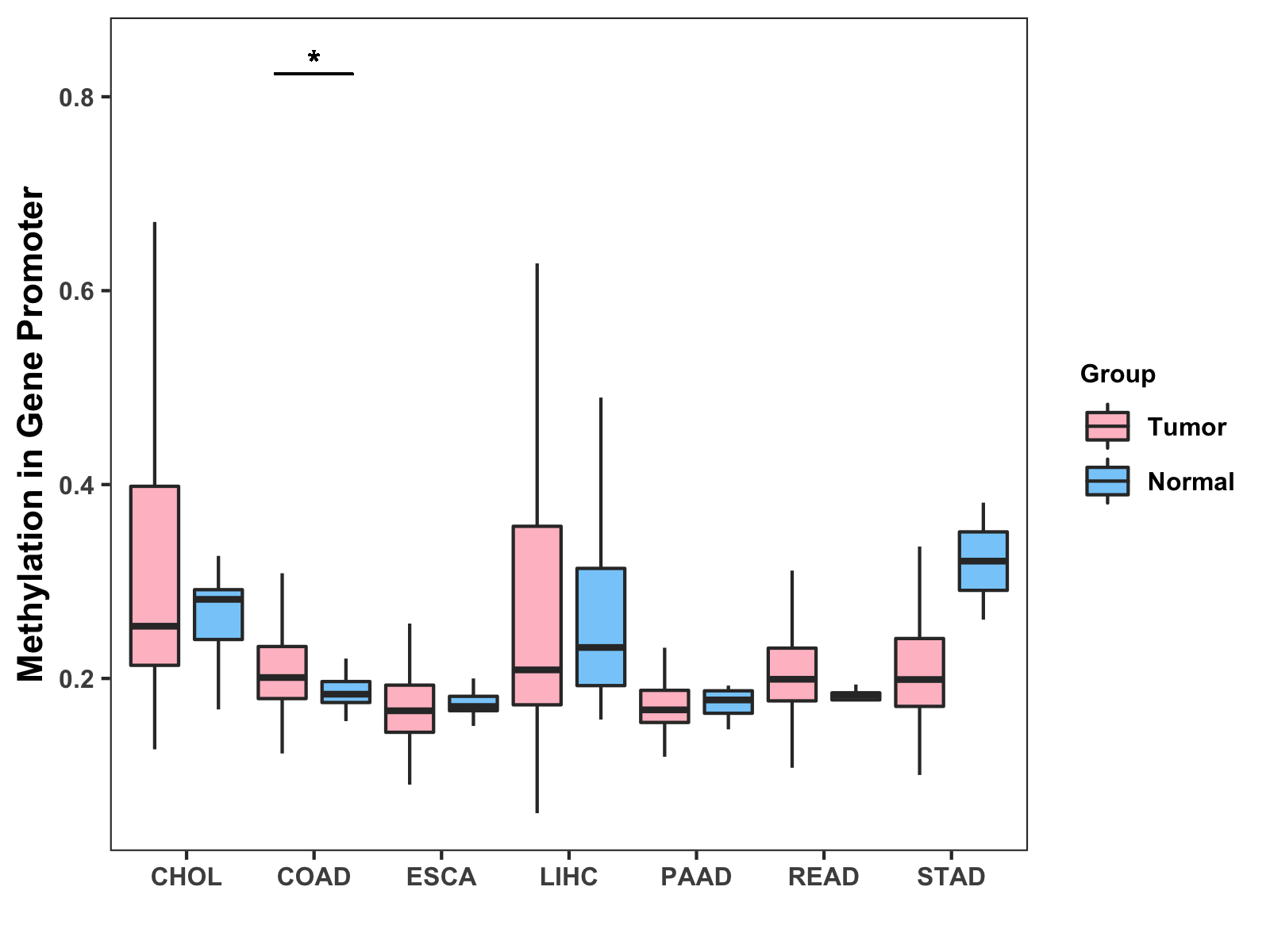 Boxplot of All Gastrointestinal Cancer ( * : 0.01-0.05 , ** : 0.005-0.01 , *** : 0.0001-0.005 , **** : < 0.0001 ) |