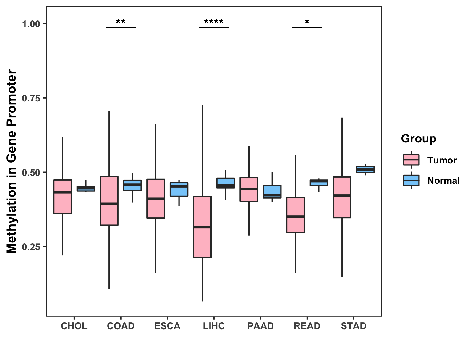 Boxplot of All Gastrointestinal Cancer ( * : 0.01-0.05 , ** : 0.005-0.01 , *** : 0.0001-0.005 , **** : < 0.0001 ) |