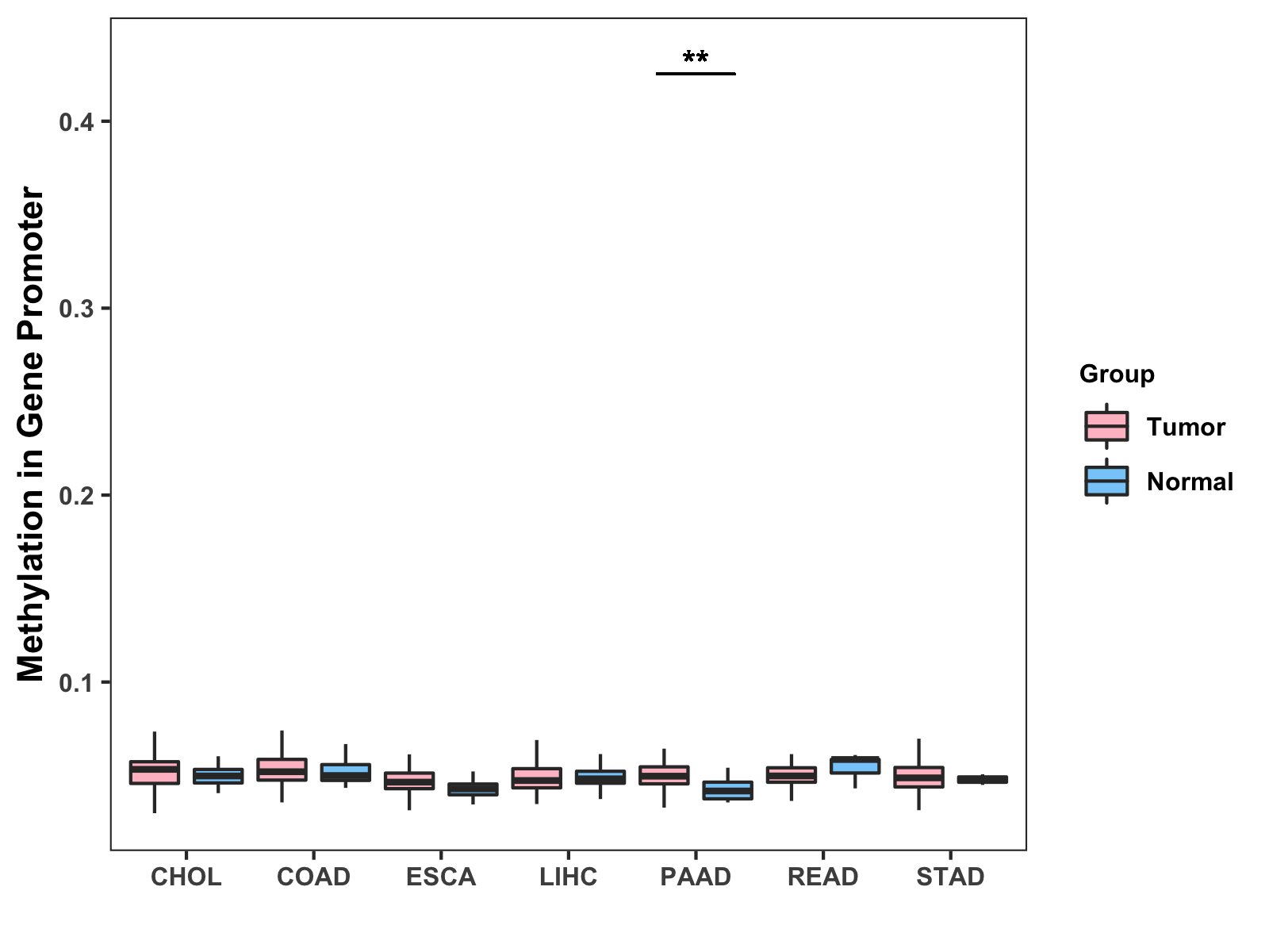 Boxplot of All Gastrointestinal Cancer ( * : 0.01-0.05 , ** : 0.005-0.01 , *** : 0.0001-0.005 , **** : < 0.0001 ) |