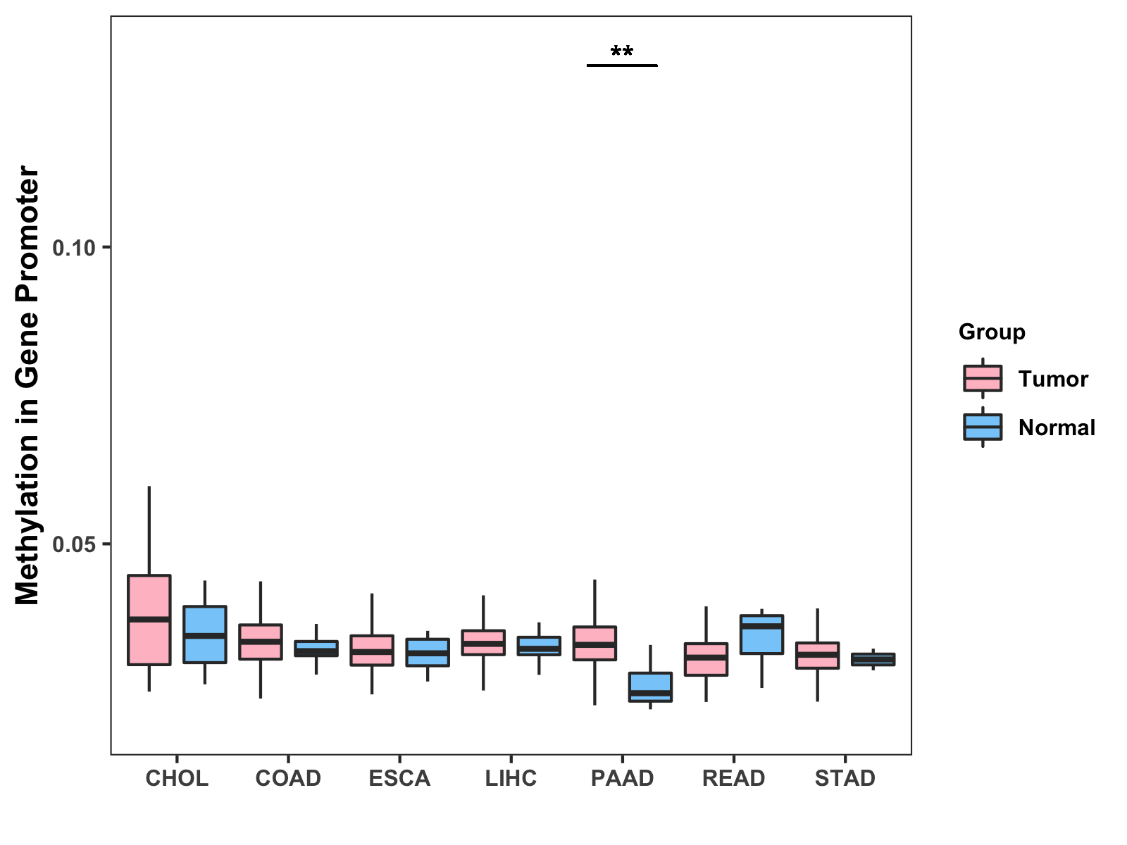 Boxplot of All Gastrointestinal Cancer ( * : 0.01-0.05 , ** : 0.005-0.01 , *** : 0.0001-0.005 , **** : < 0.0001 ) |