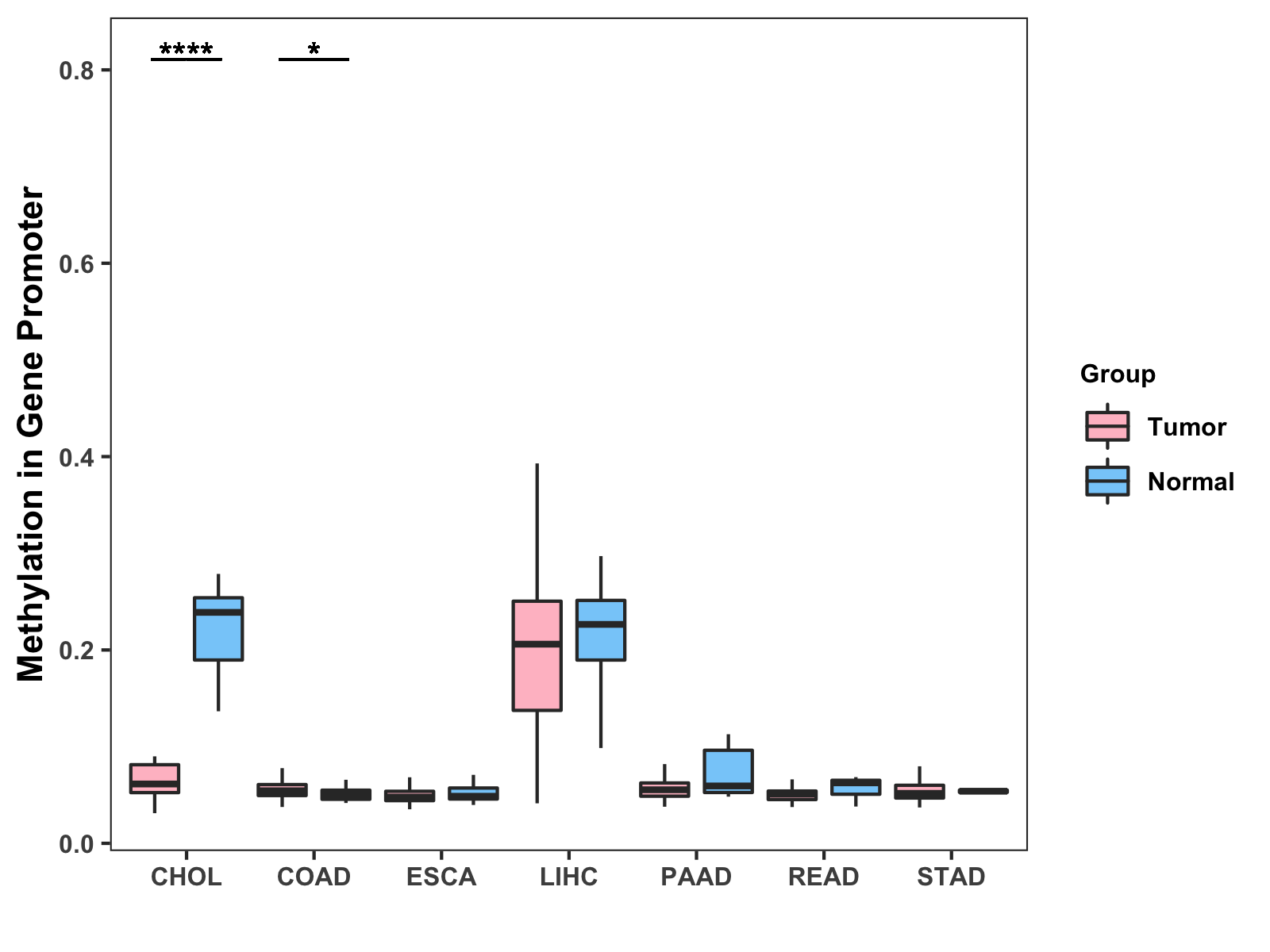 Boxplot of All Gastrointestinal Cancer ( * : 0.01-0.05 , ** : 0.005-0.01 , *** : 0.0001-0.005 , **** : < 0.0001 ) |