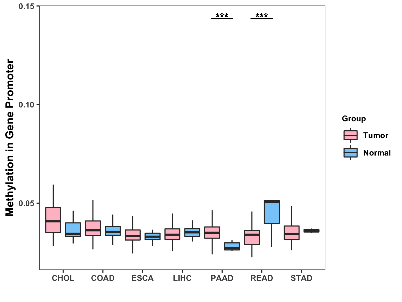 Boxplot of All Gastrointestinal Cancer ( * : 0.01-0.05 , ** : 0.005-0.01 , *** : 0.0001-0.005 , **** : < 0.0001 ) |
