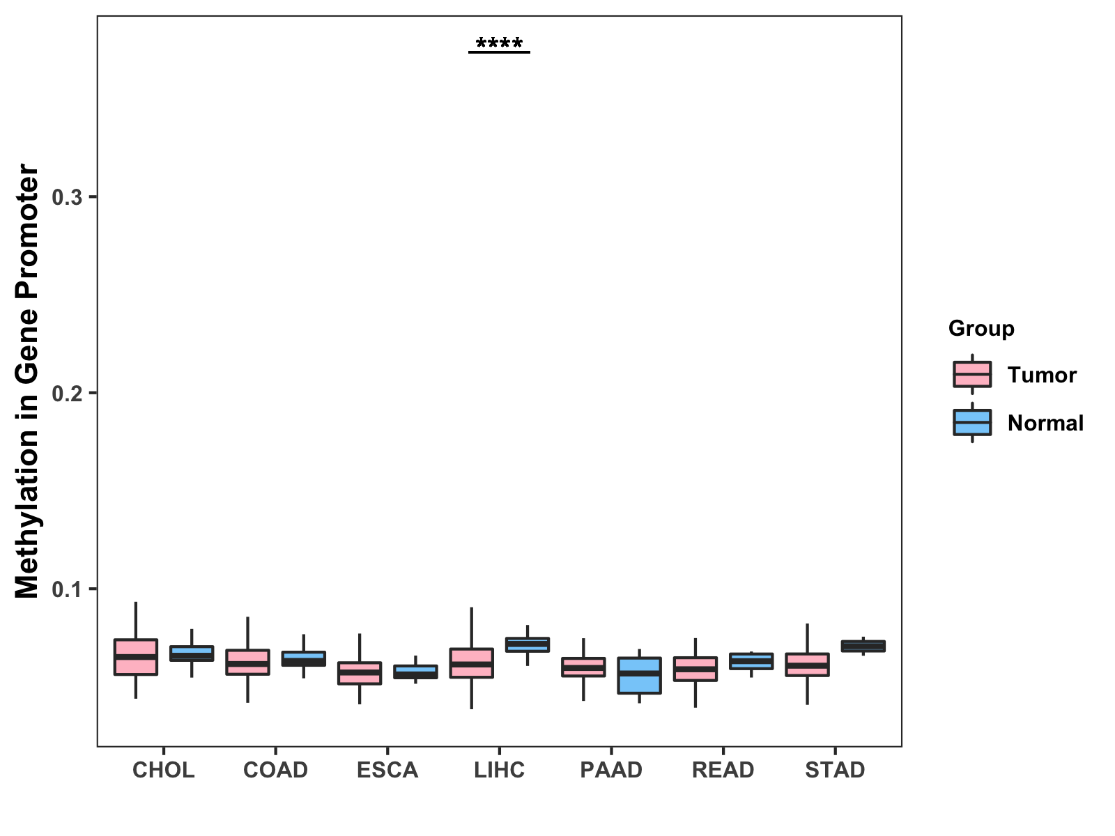Boxplot of All Gastrointestinal Cancer ( * : 0.01-0.05 , ** : 0.005-0.01 , *** : 0.0001-0.005 , **** : < 0.0001 ) |