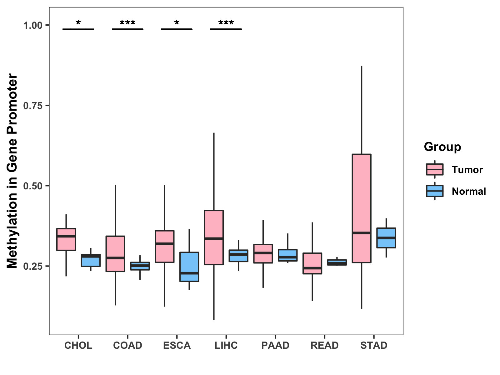Boxplot of All Gastrointestinal Cancer ( * : 0.01-0.05 , ** : 0.005-0.01 , *** : 0.0001-0.005 , **** : < 0.0001 ) |