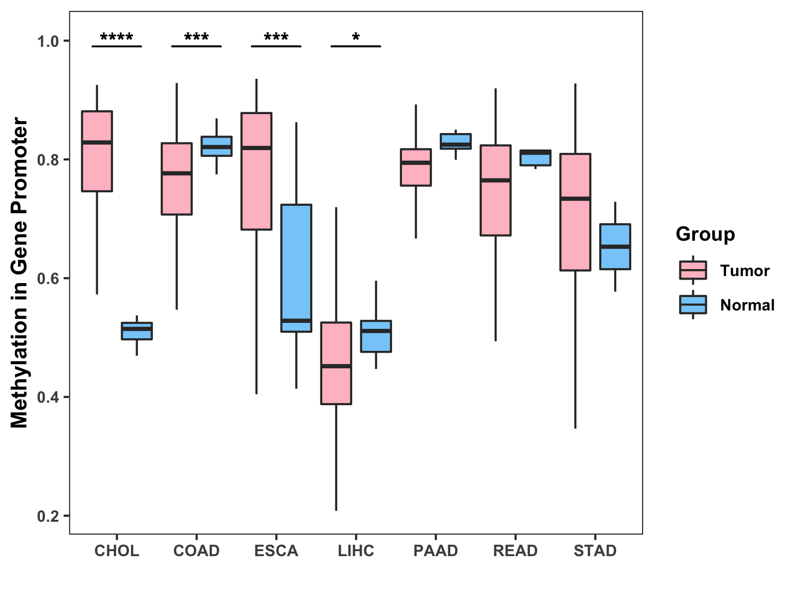 Boxplot of All Gastrointestinal Cancer ( * : 0.01-0.05 , ** : 0.005-0.01 , *** : 0.0001-0.005 , **** : < 0.0001 ) |