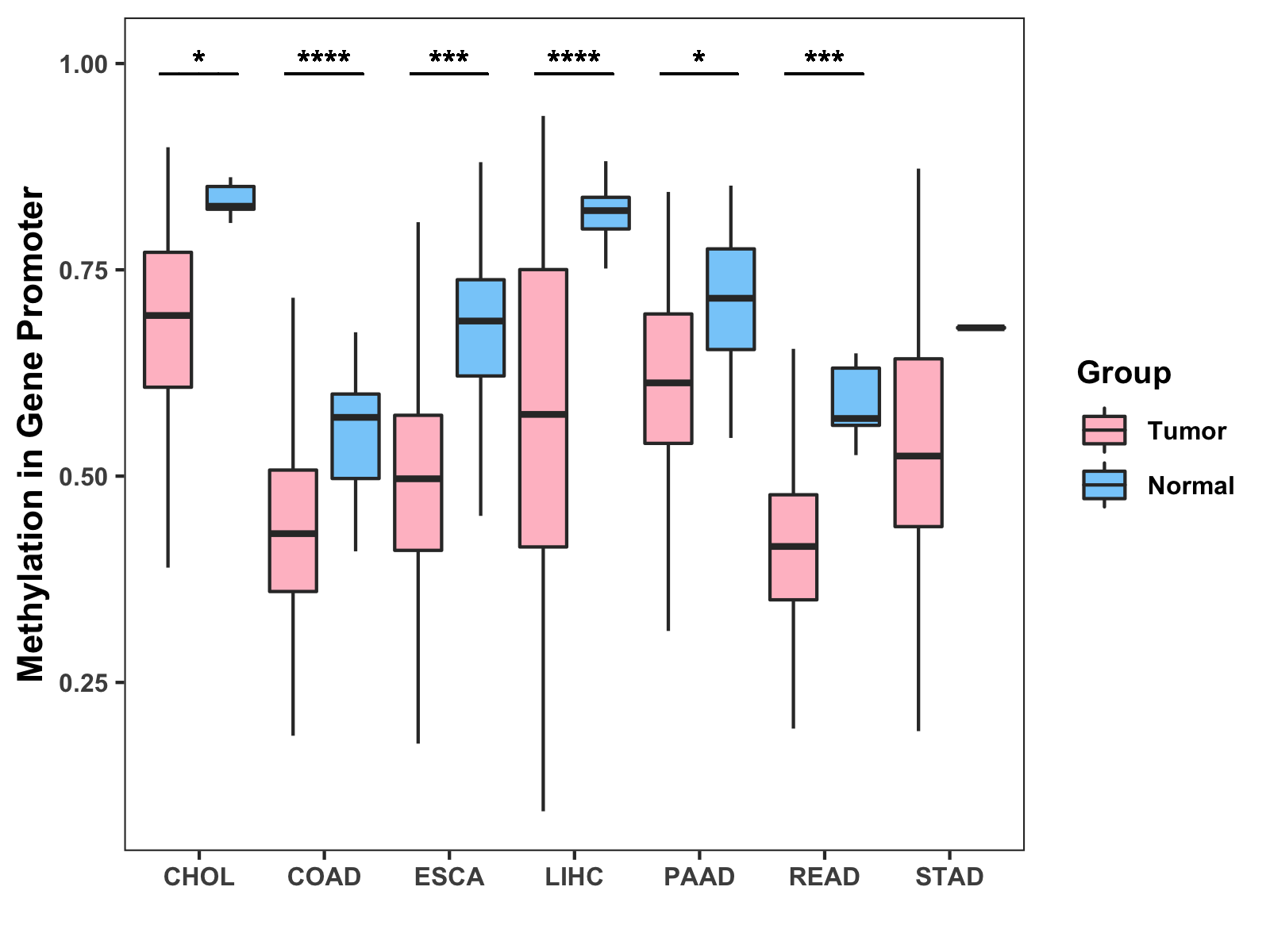 Boxplot of All Gastrointestinal Cancer ( * : 0.01-0.05 , ** : 0.005-0.01 , *** : 0.0001-0.005 , **** : < 0.0001 ) |