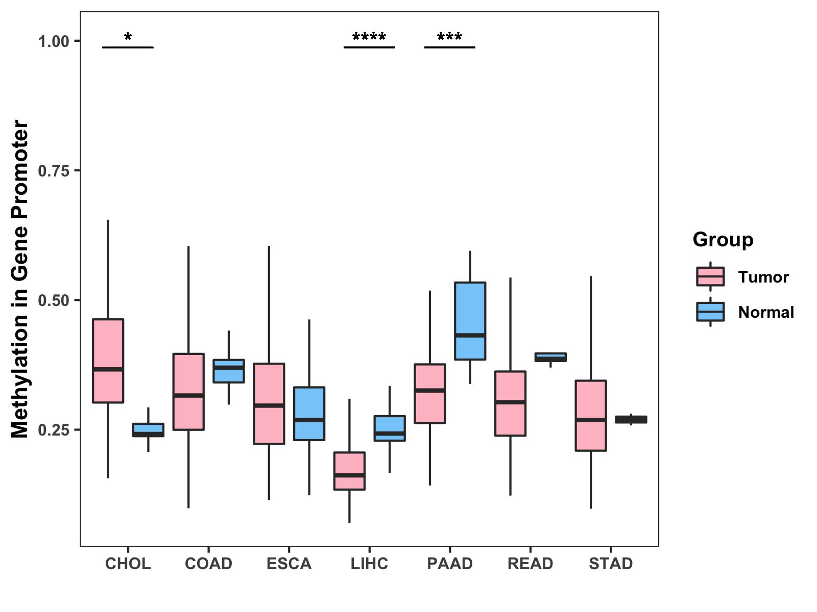 Boxplot of All Gastrointestinal Cancer ( * : 0.01-0.05 , ** : 0.005-0.01 , *** : 0.0001-0.005 , **** : < 0.0001 ) |