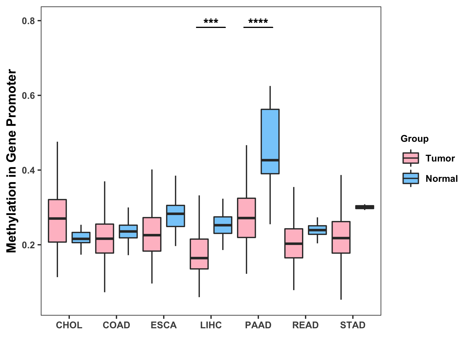 Boxplot of All Gastrointestinal Cancer ( * : 0.01-0.05 , ** : 0.005-0.01 , *** : 0.0001-0.005 , **** : < 0.0001 ) |